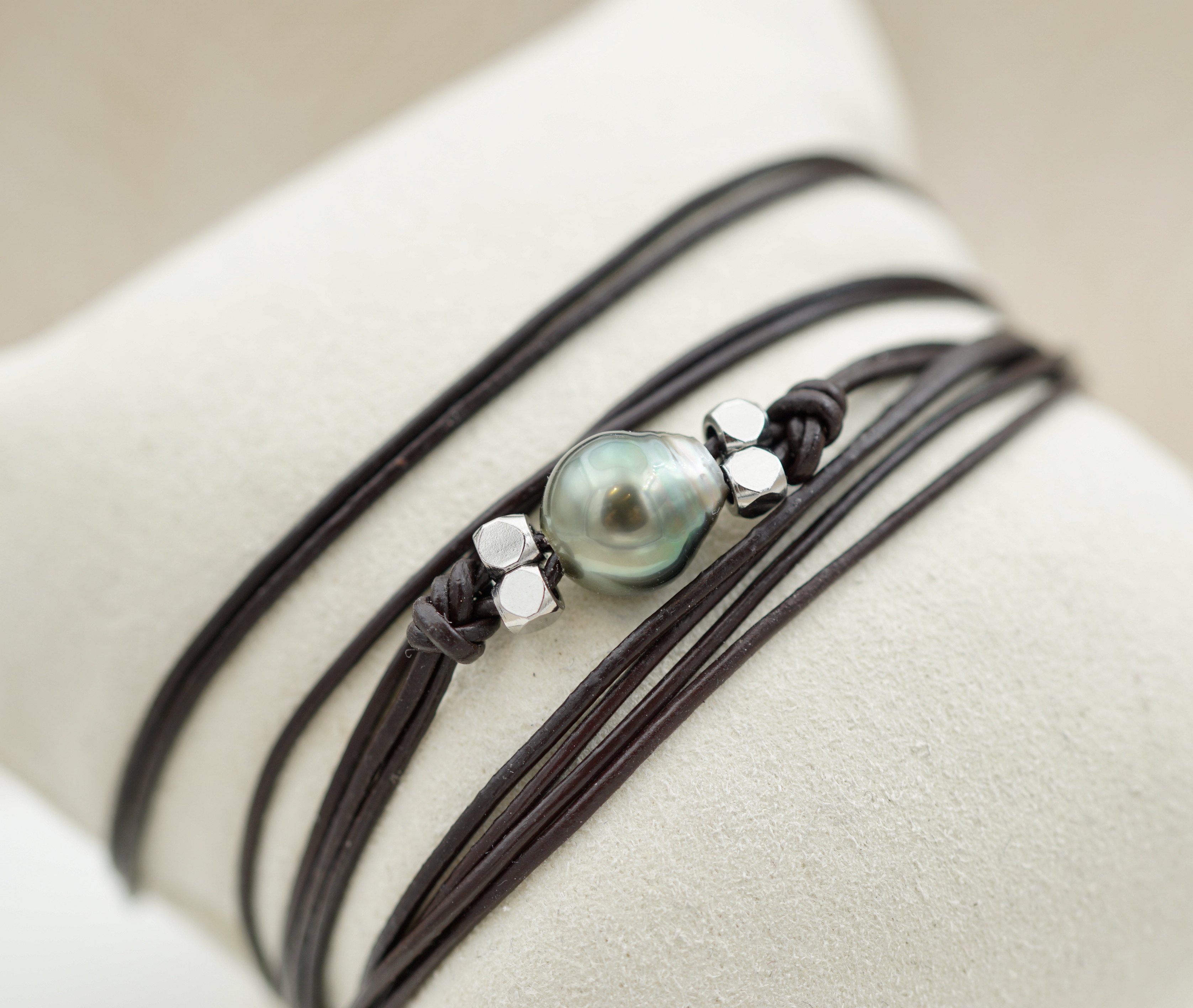 Splendide bracelet orné d’une véritable perle noire de culture de Tahiti. Sélectionnée pour son lustre profond et ses reflets uniques, chaque perle incarne la pureté des lagons polynésiens.