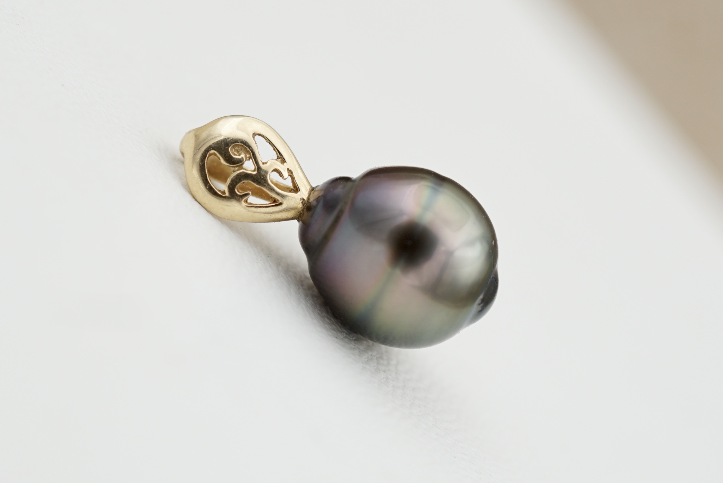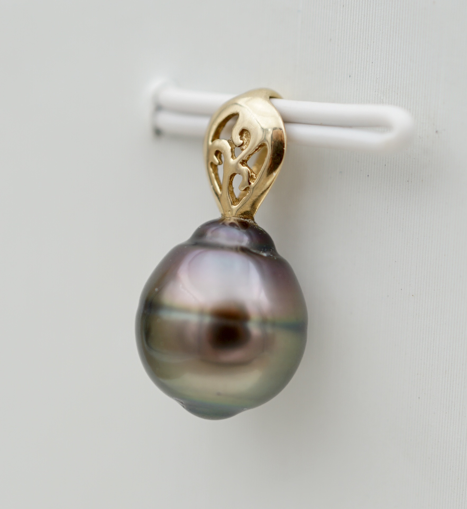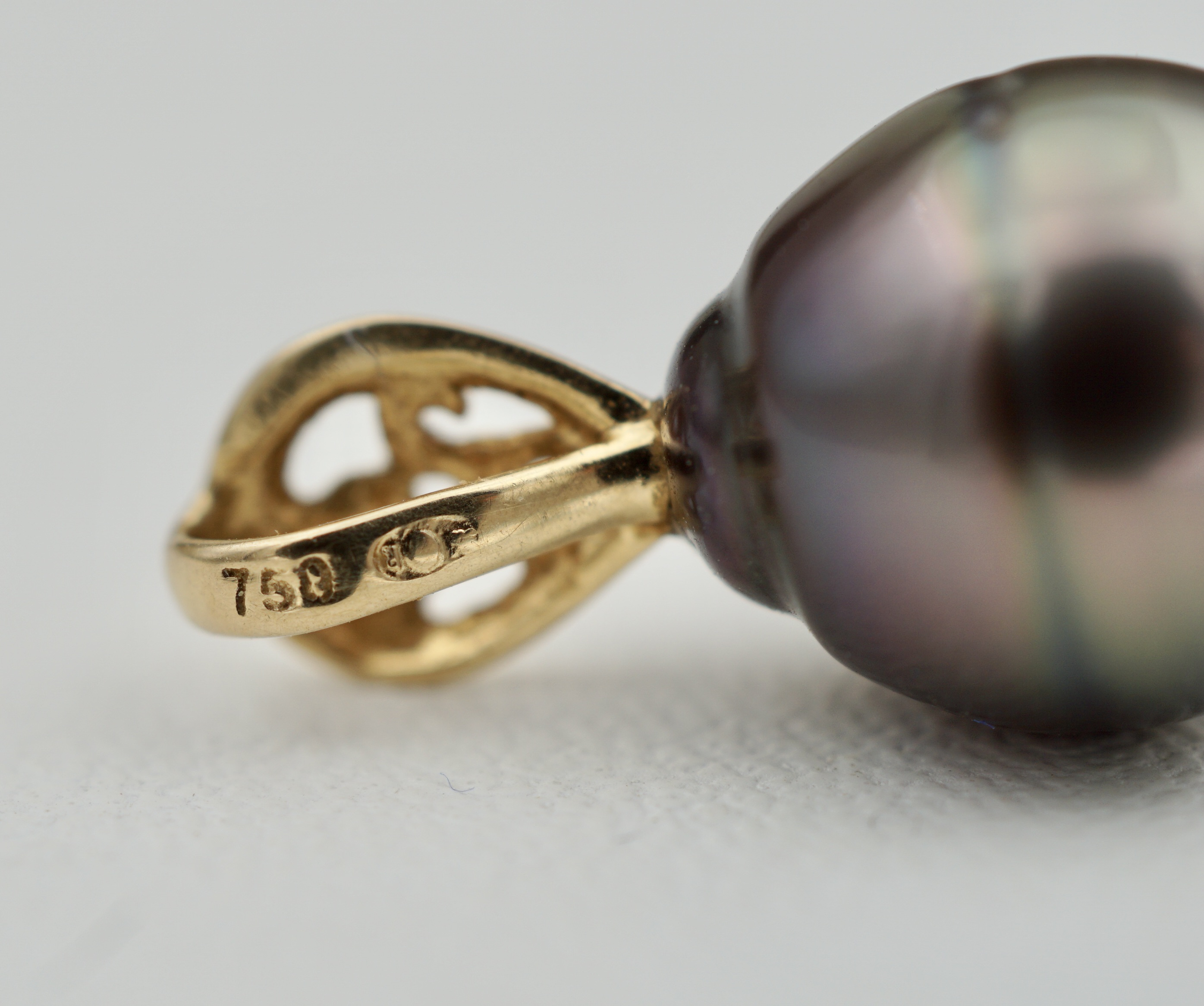 • Perle de Tahiti authentique (9 mm) : reflets aubergine, verts et dorés