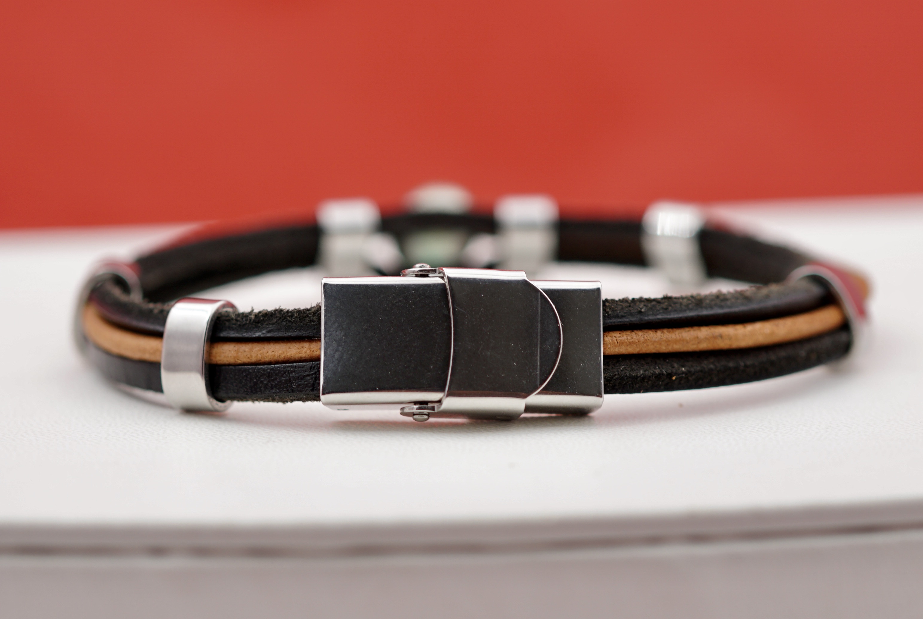 Monté sur un lien en cuir, souple et résistant, ce bracelet allie la noblesse des matières brutes à la finesse du détail, il épouse délicatement la ligne du poignet pour un port confortable et personnalisé.