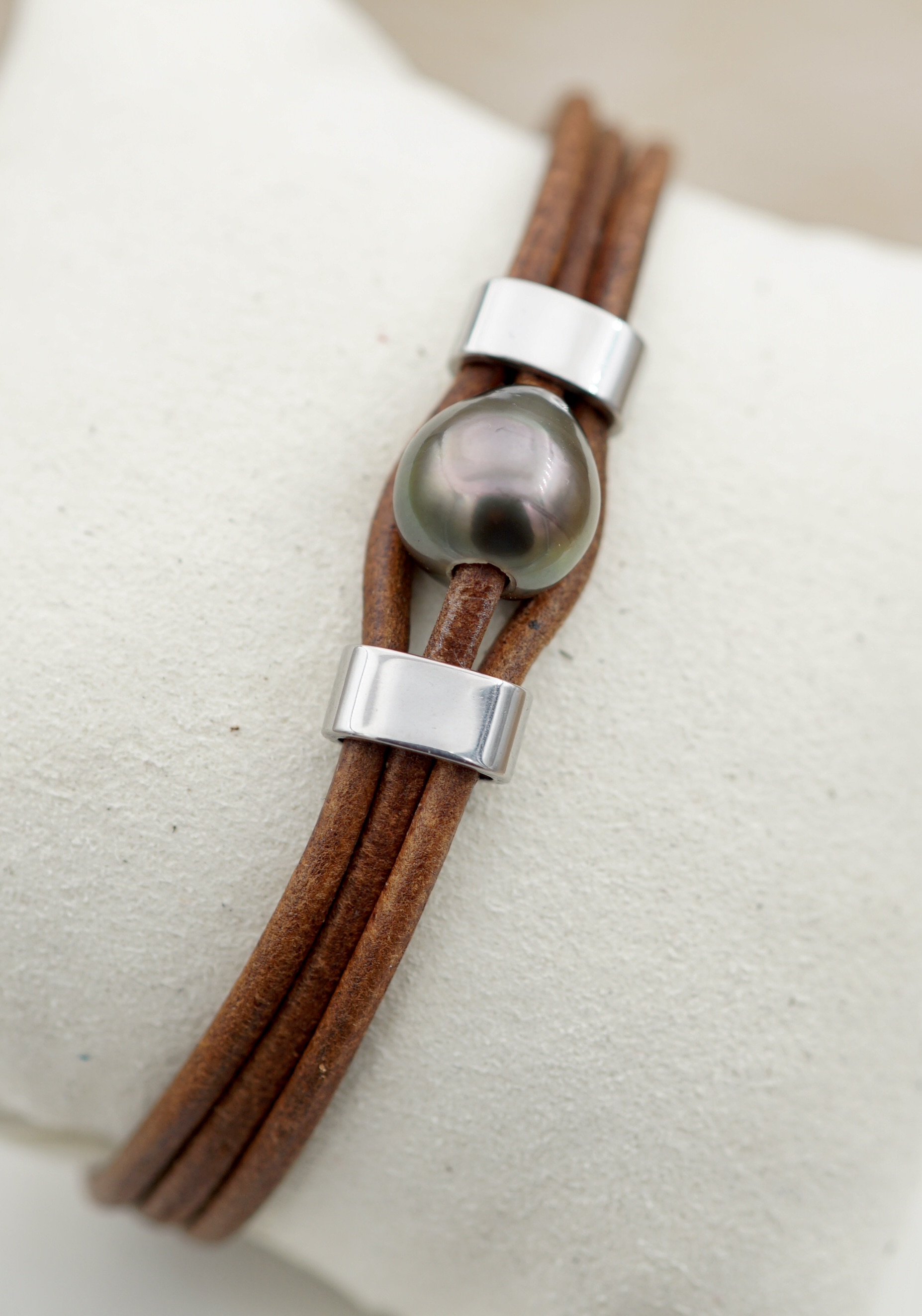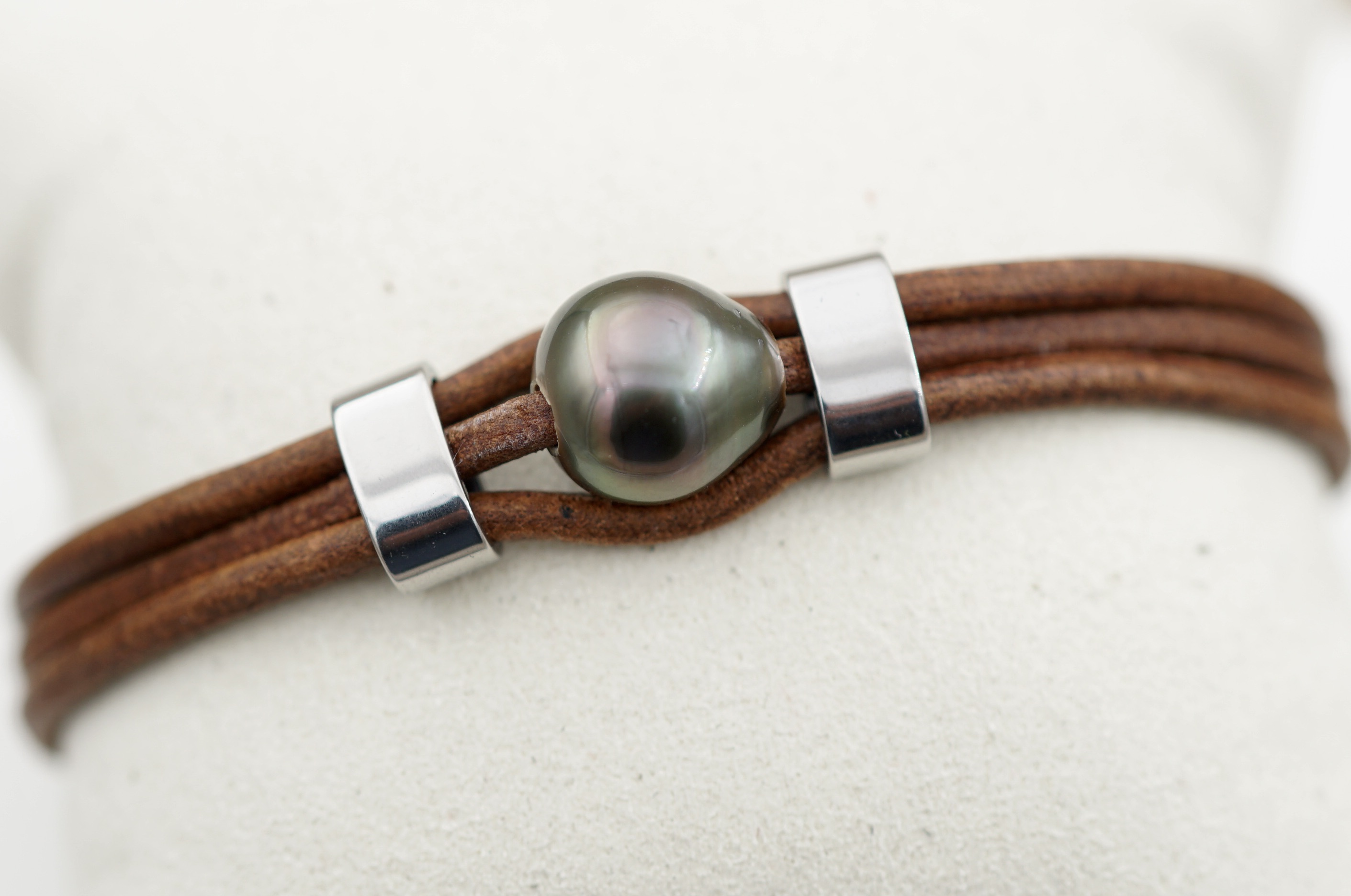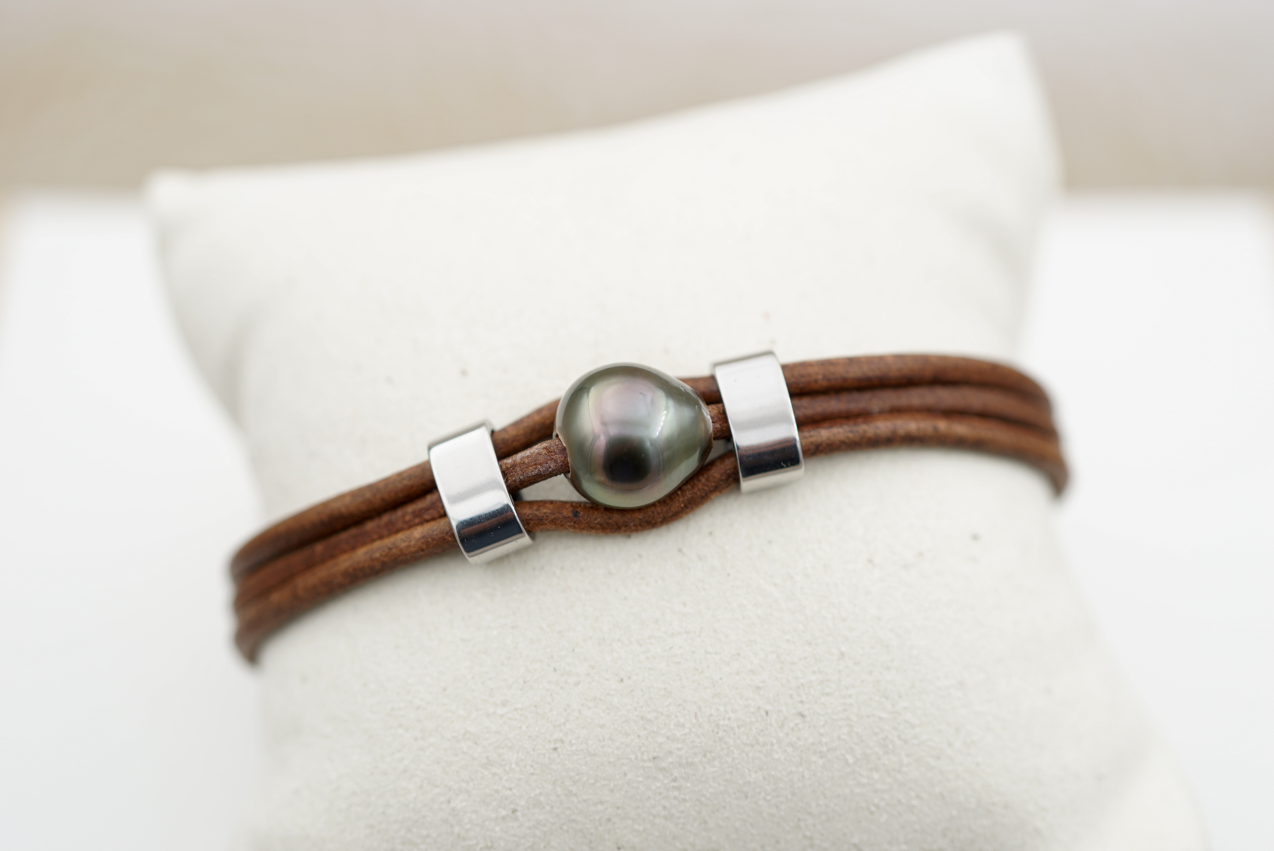 Succombez à l’élégance naturelle de ce bracelet en cuir véritable, sublimé par une superbe perle de Tahiti rigoureusement sélectionnée. Cette perle dévoile une richesse de reflets – aubergine, vert émeraude, bronze ou argenté – évoquant les teintes mystérieuses des lagons polynésiens.