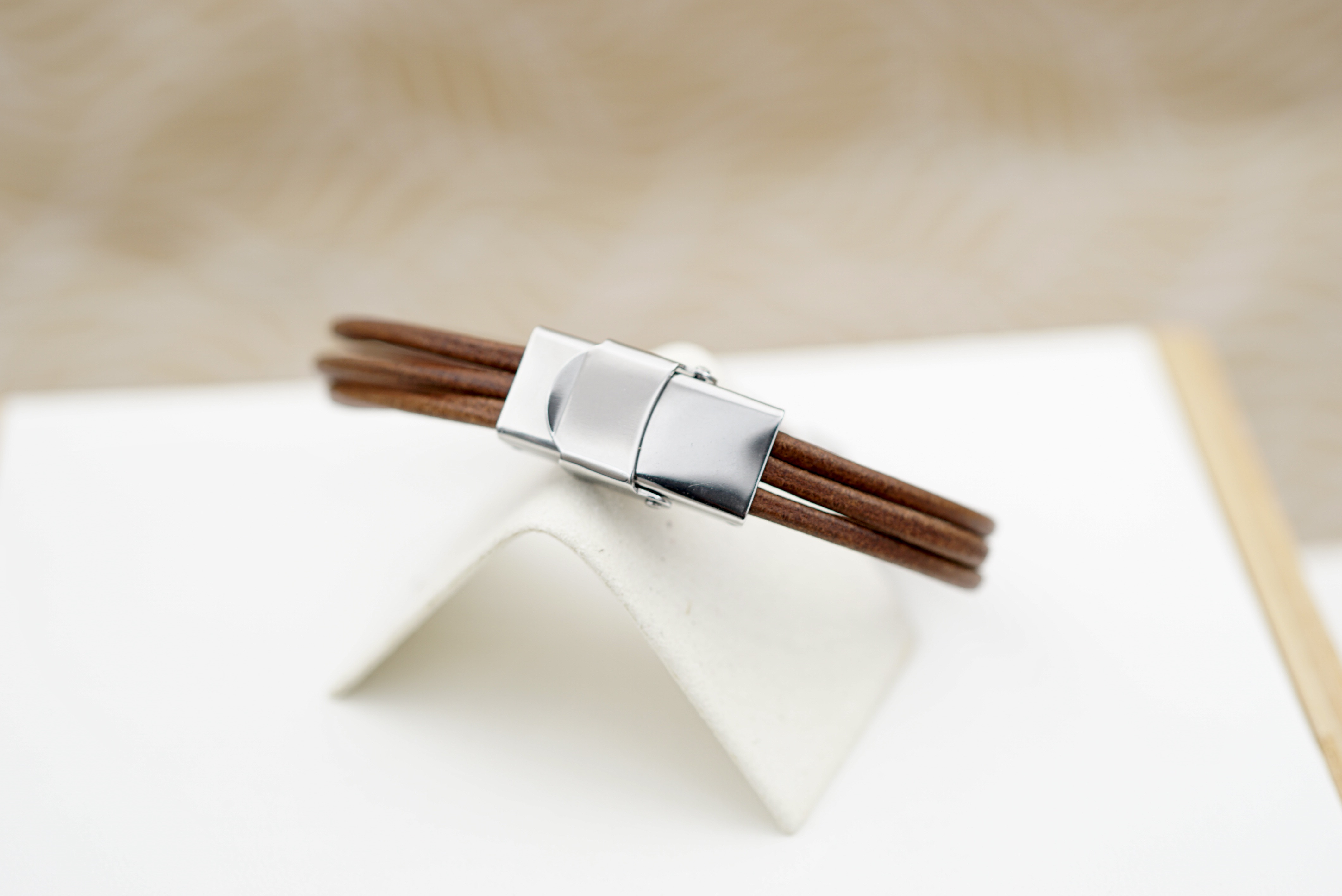 Monté sur un lien en cuir, souple et résistant, ce bracelet allie la noblesse des matières brutes à la finesse du détail, il épouse délicatement la ligne du poignet pour un port confortable et personnalisé.