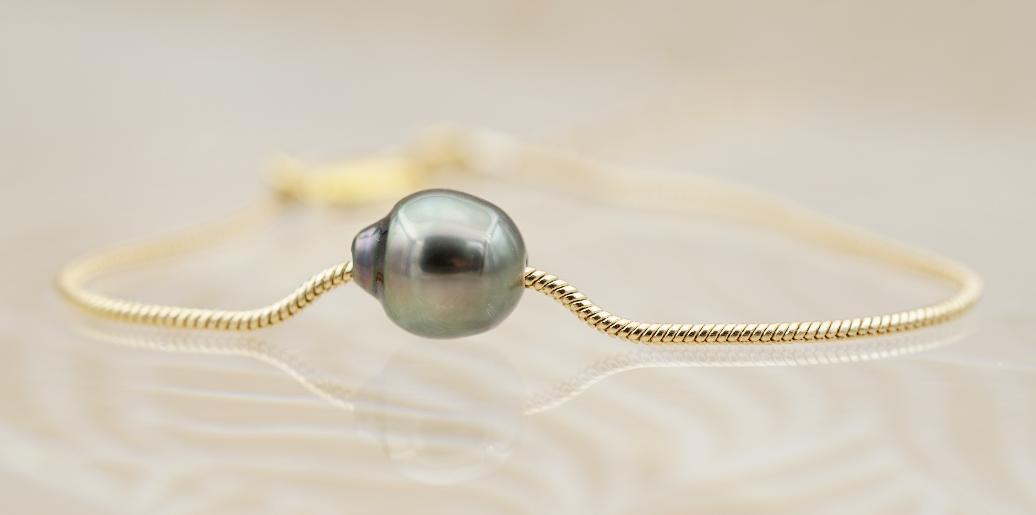 Cette perle est sélectionnée pour son lustre intense et ses reflets profonds, hérités des eaux pures de Polynésie.