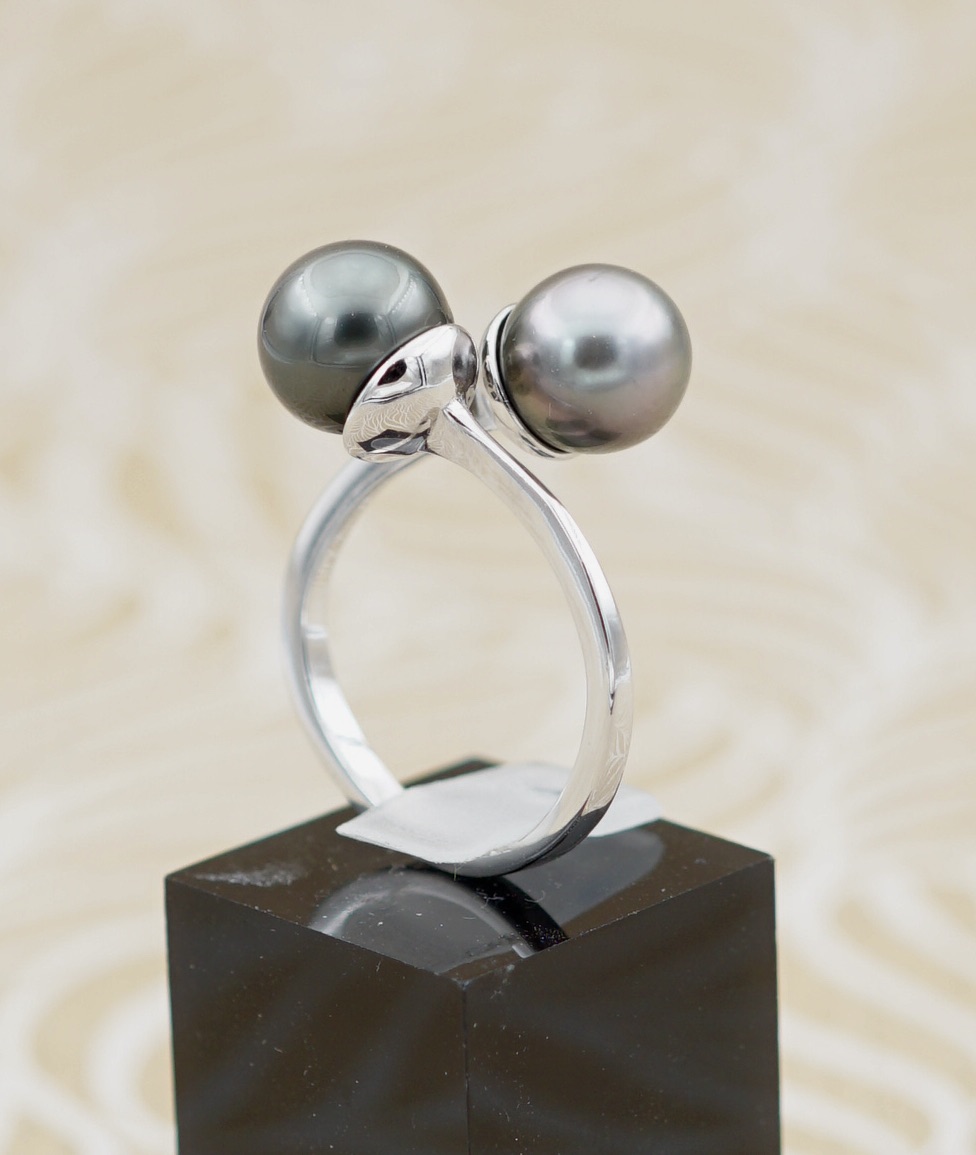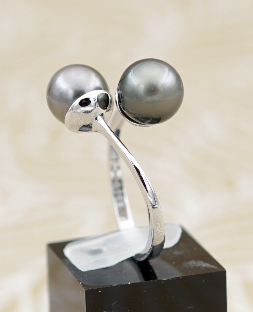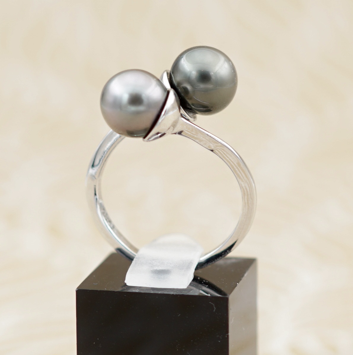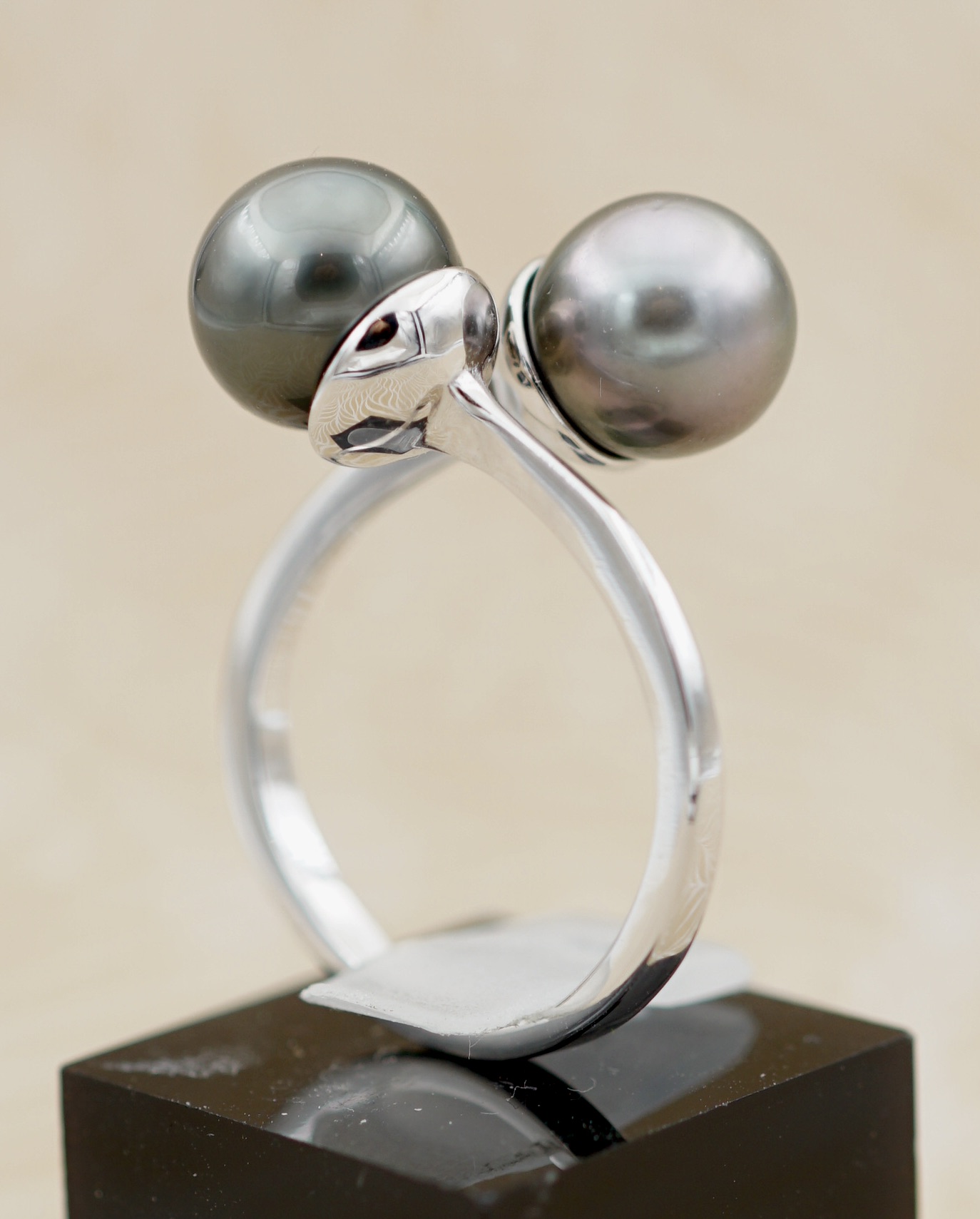 Cette bague en argent massif, sertie de deux perles de Tahiti sélectionnées avec soin, incarne le raffinement à l’état pur. Les perles révèlent des nuances profondes – aubergine, vert ou bronze – pour une touche de luxe sobre et naturelle.