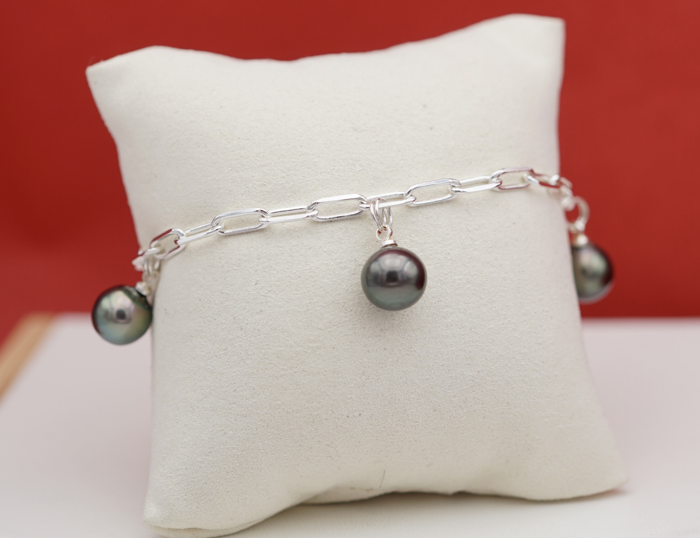 Ce bracelet en argent 925mm, orné de perles de Tahiti sélectionnées pour leur éclat unique, incarne un équilibre parfait entre modernité et tradition. Chaque perle dévoile des reflets profonds – aubergine, vert, bronze – pour un rendu à la fois subtil et luxueux.