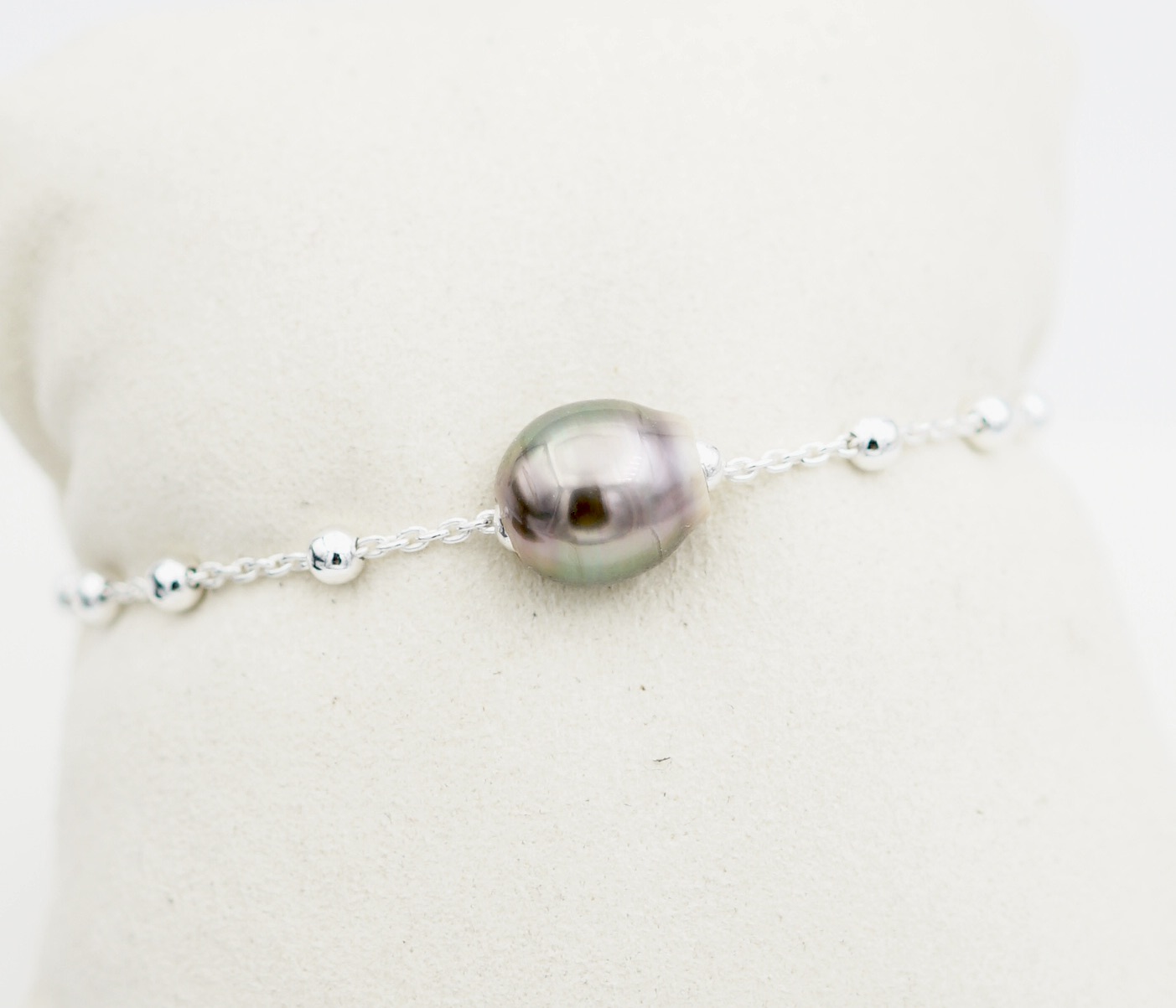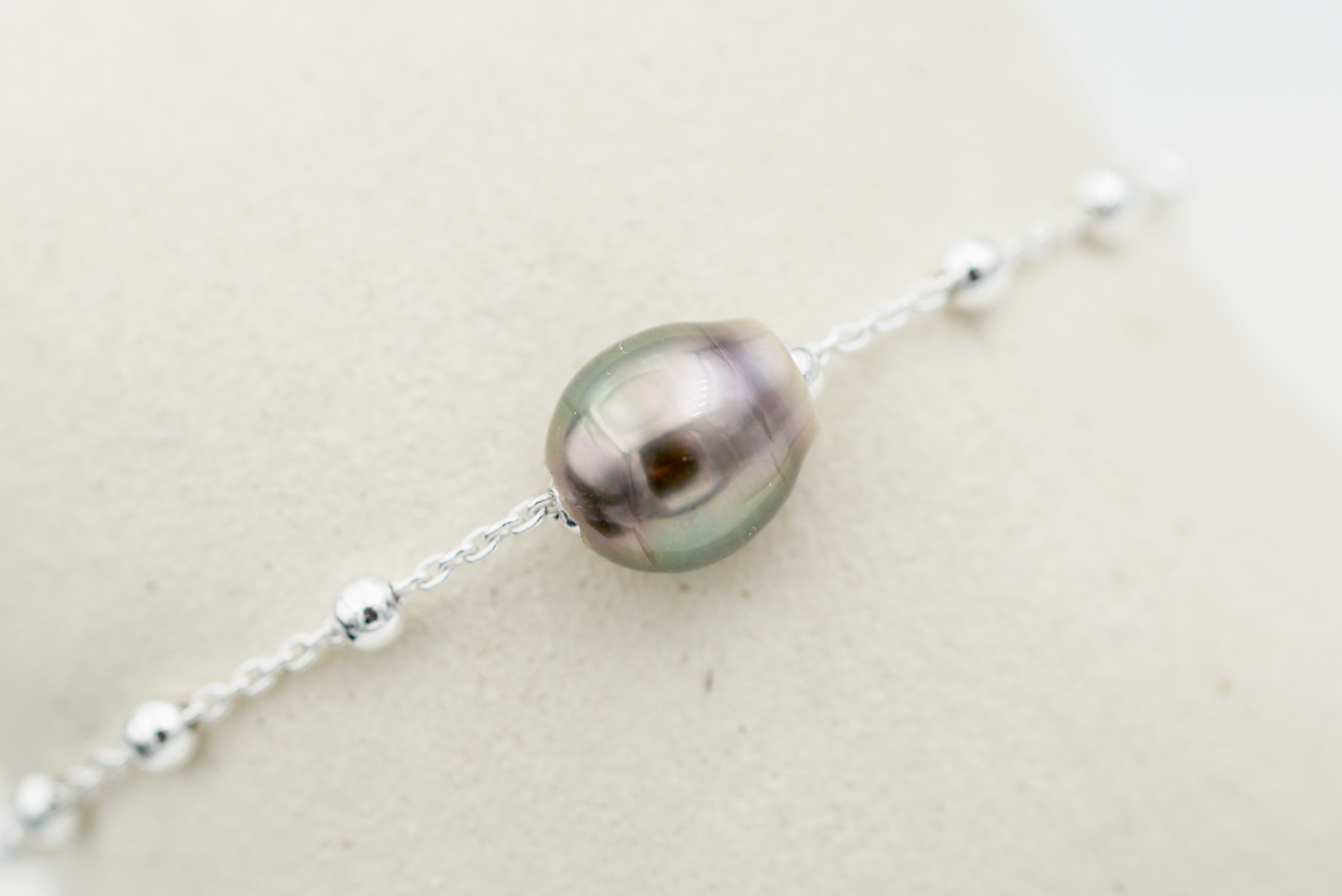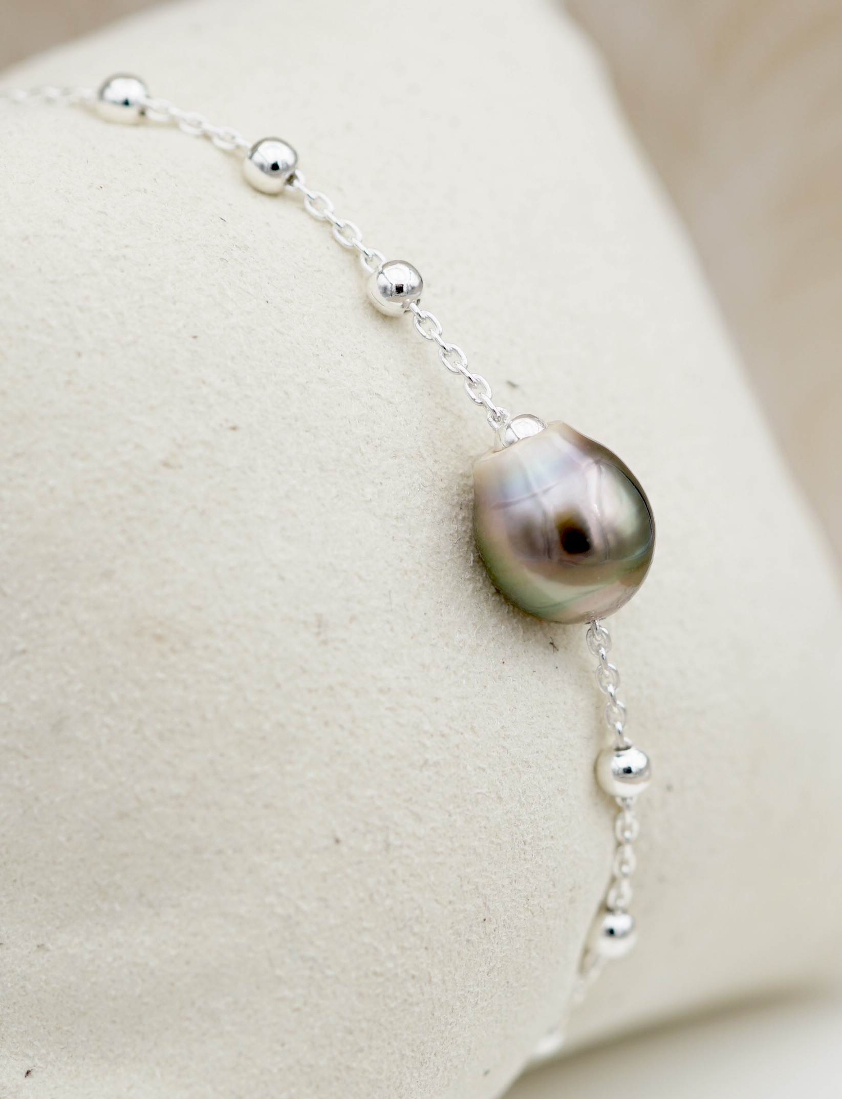 Succombez à l’élégance intemporelle de ce bracelet en argent rhodié, orné d’une sublime perle de Tahiti rigoureusement sélectionnée pour son éclat rare et leur beauté naturelle. Cettee perle, unique, dévoile une symphonie de reflets profonds : aubergine, vert émeraude, bronze ou nuances argentées – un camaïeu fascinant issu des trésors des lagons polynésiens.