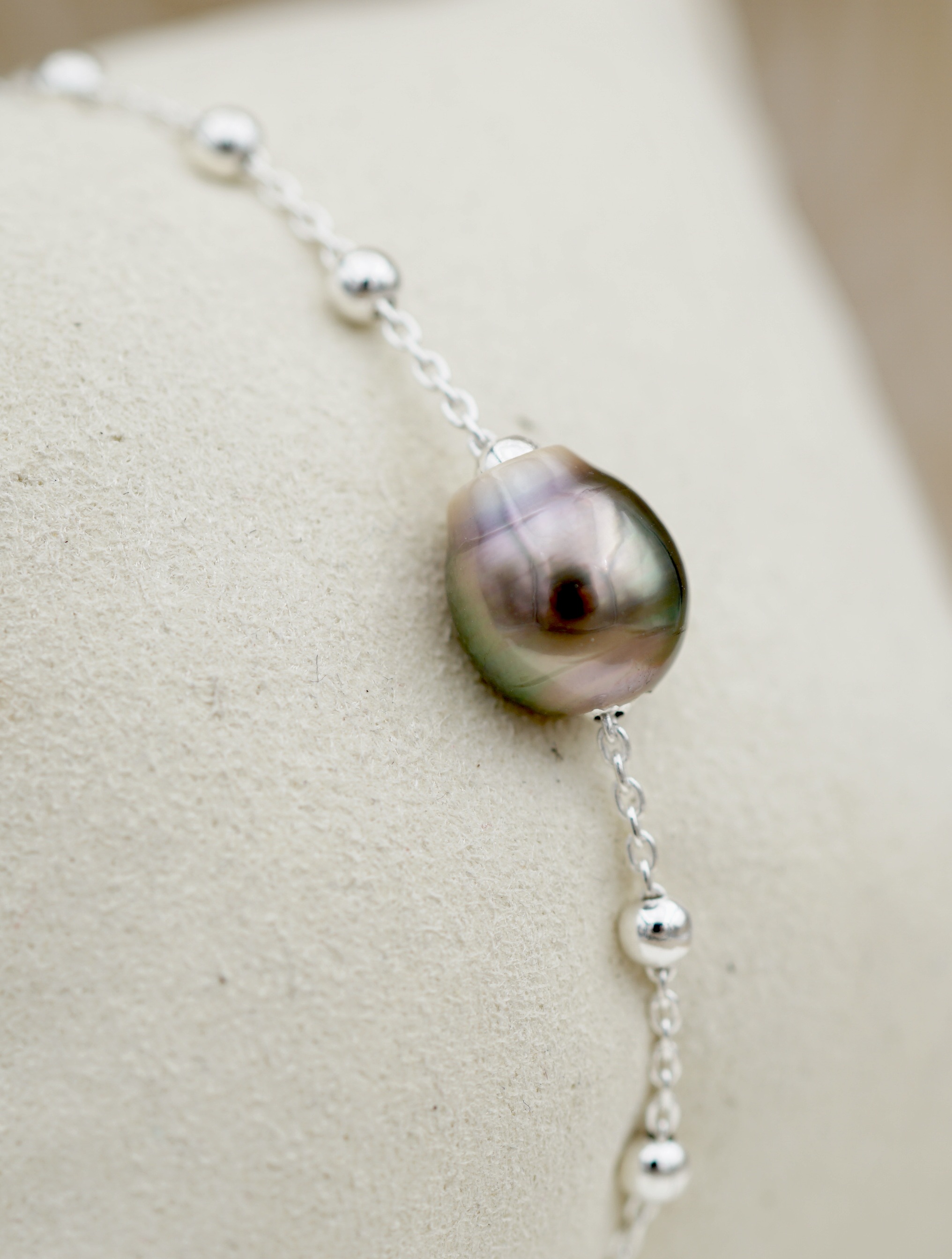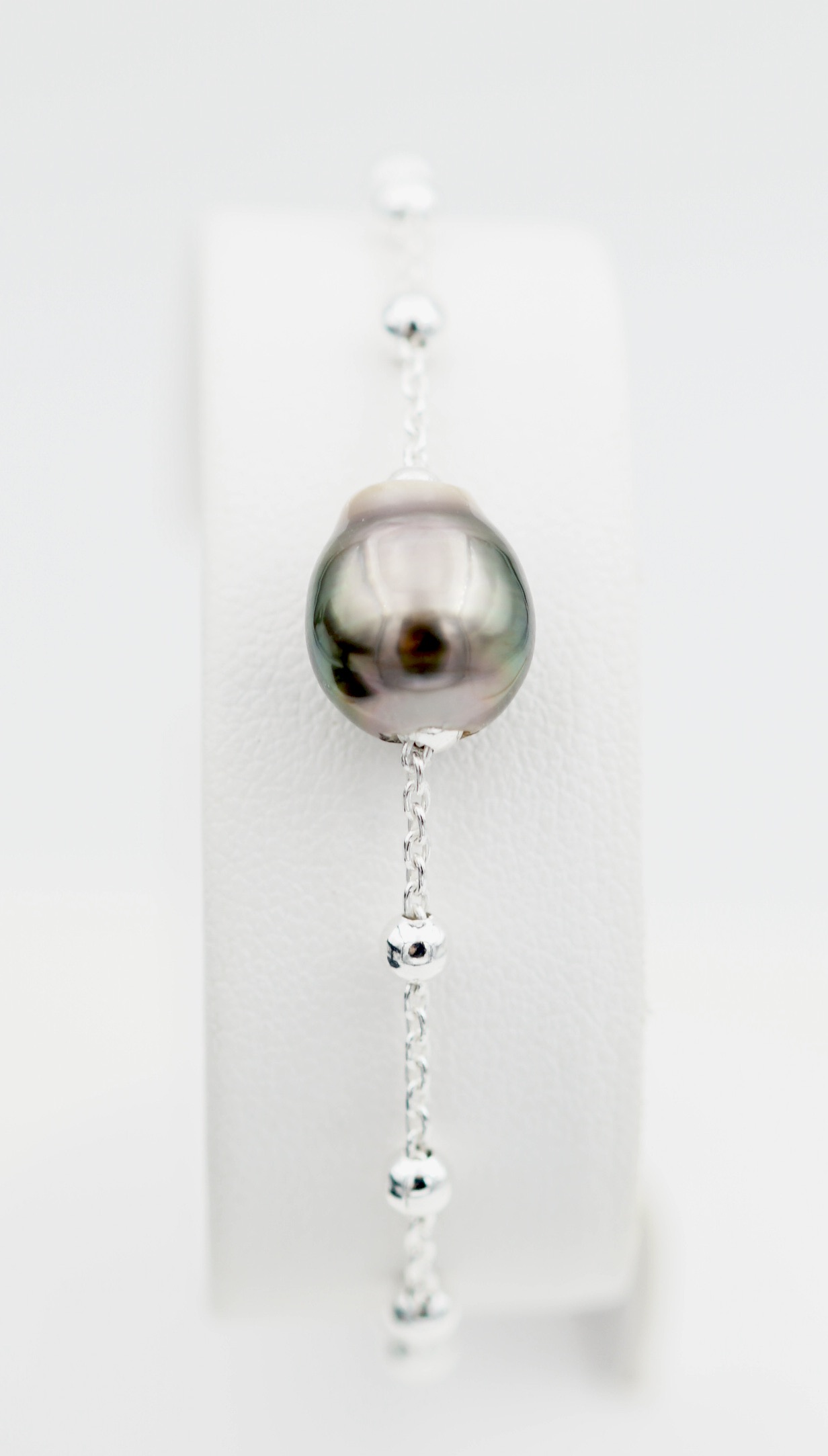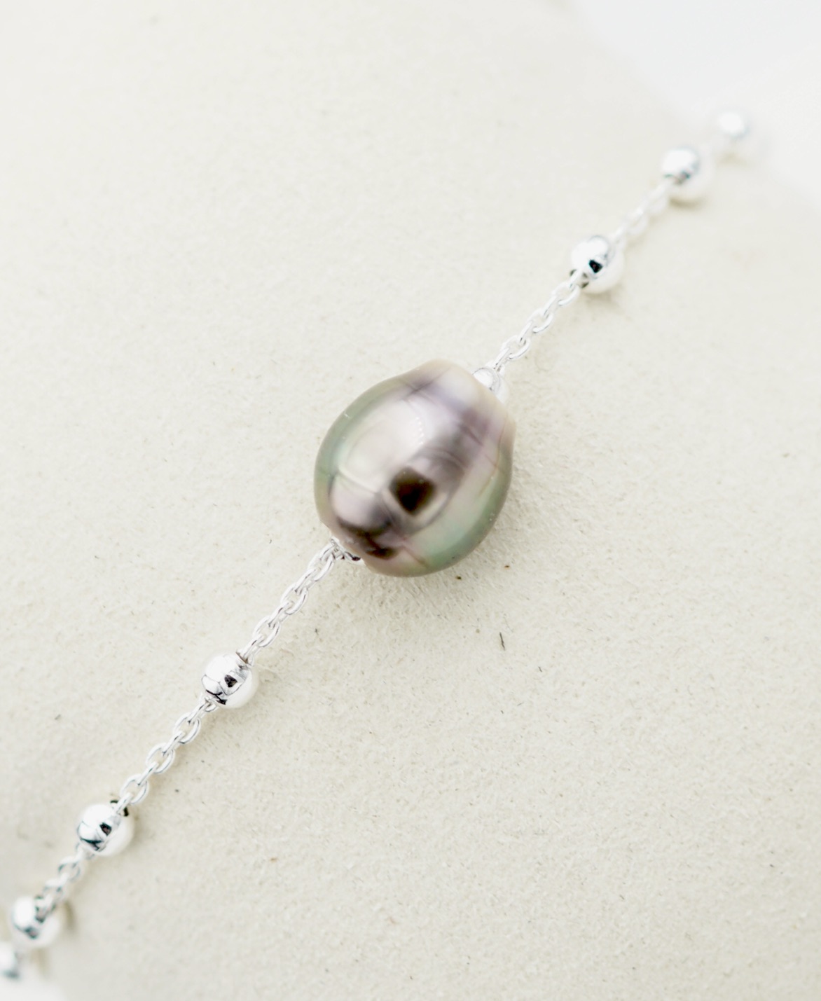 Succombez à l’élégance intemporelle de ce bracelet en argent rhodié, orné d’une sublime perle de Tahiti rigoureusement sélectionnée pour son éclat rare et leur beauté naturelle. Cettee perle, unique, dévoile une symphonie de reflets profonds : aubergine, vert émeraude, bronze ou nuances argentées – un camaïeu fascinant issu des trésors des lagons polynésiens.