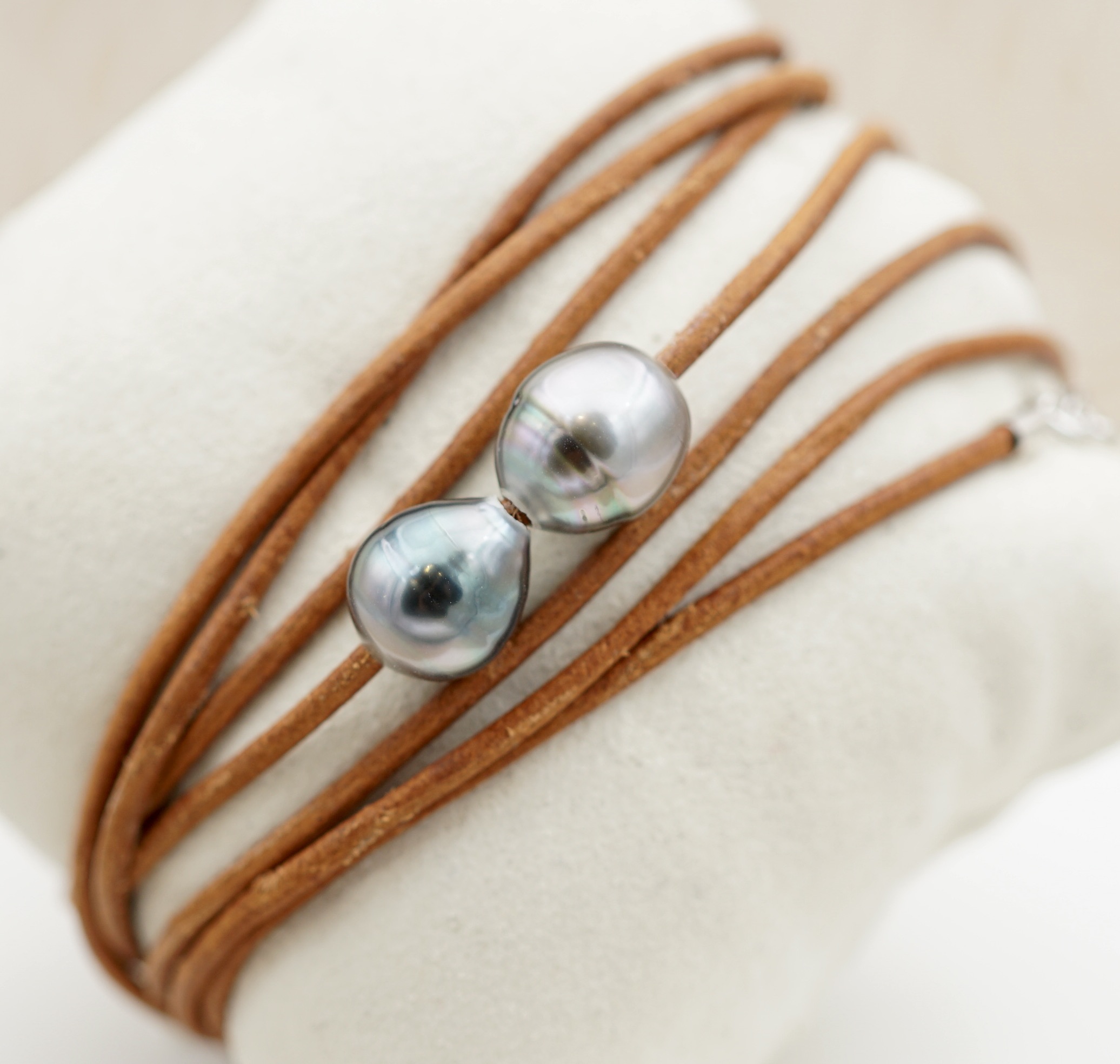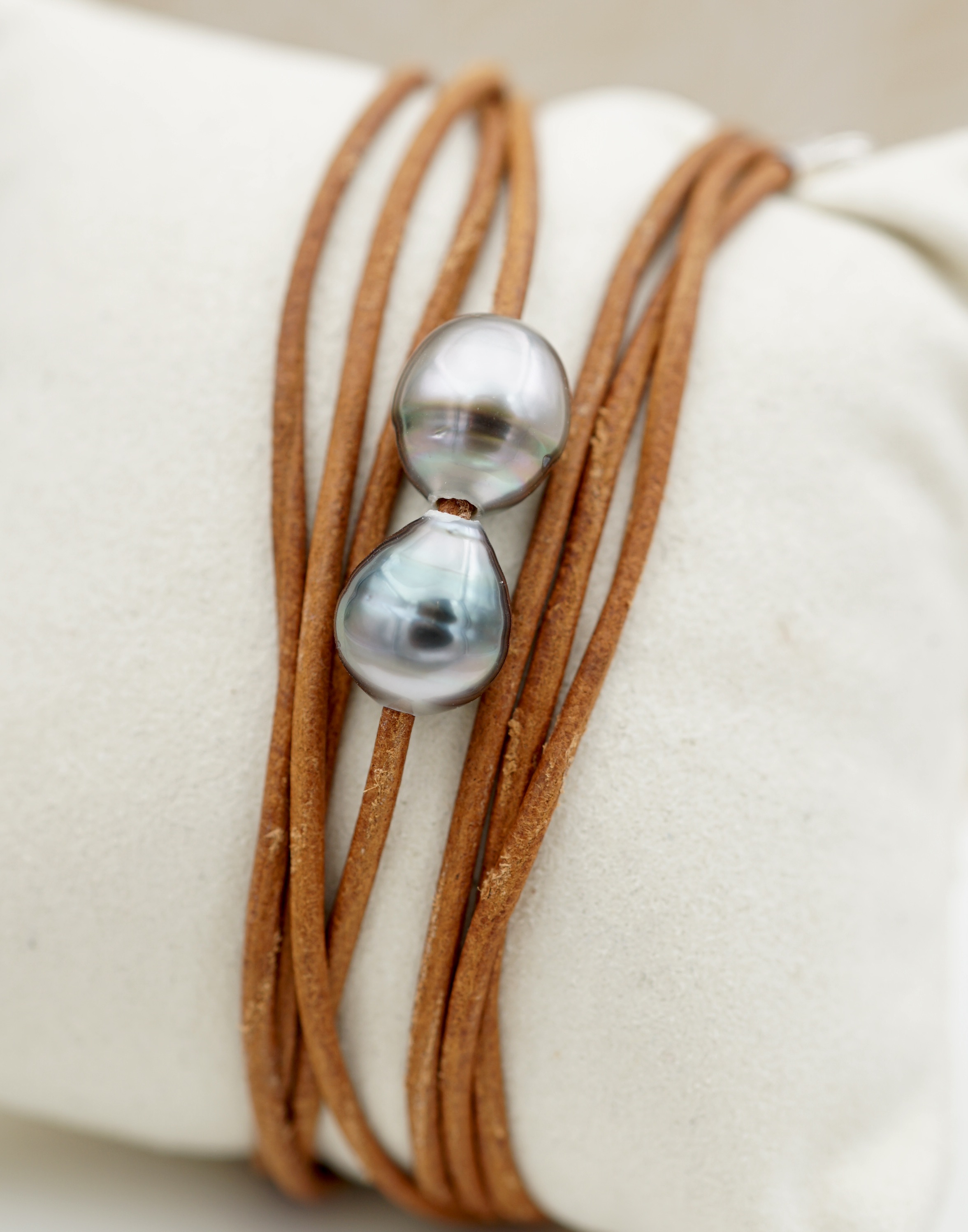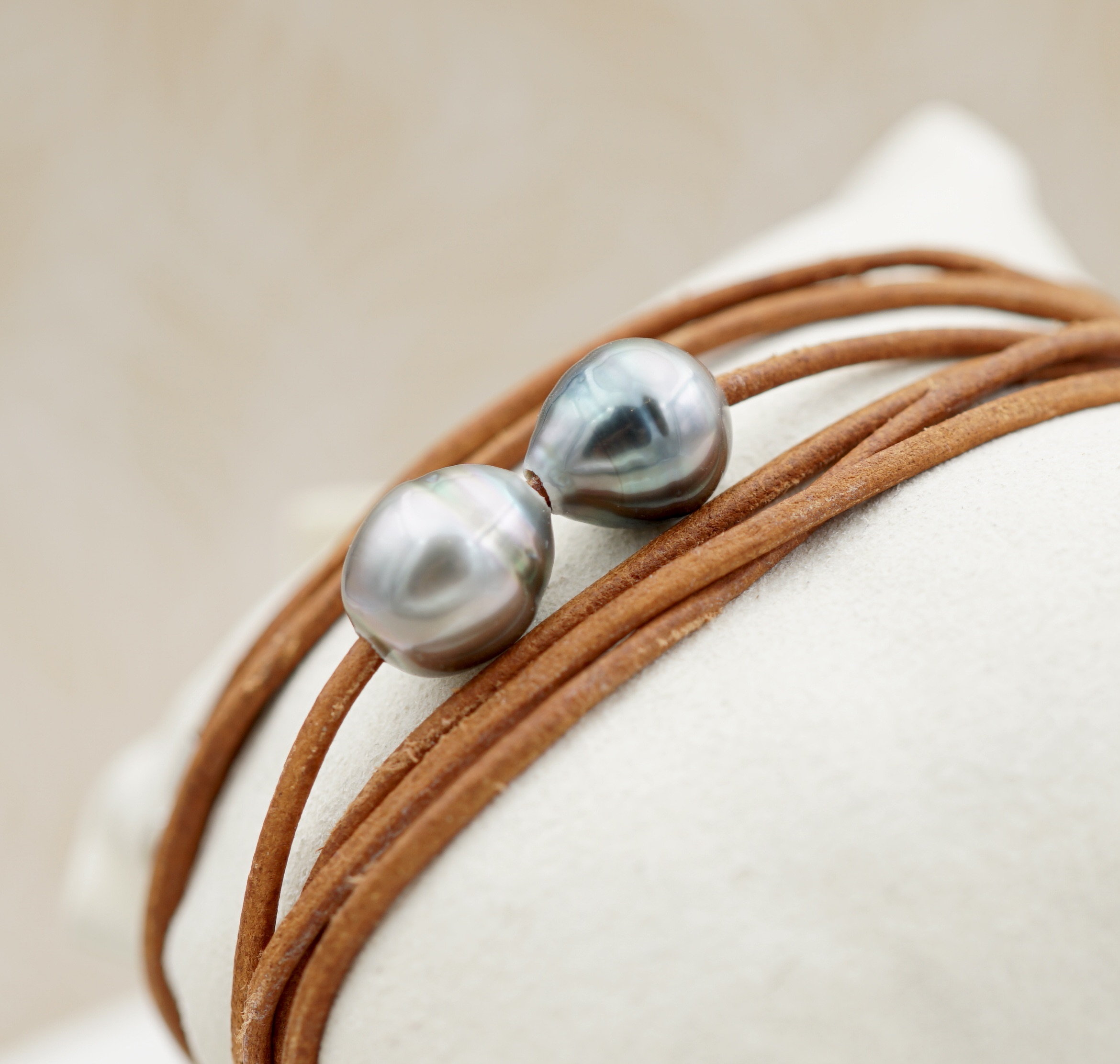 Ce bracelet en cuir véritable, orné de deux perles de Tahiti soigneusement sélectionnées, incarne un équilibre subtil entre modernité et tradition. Les perles dévoilent des reflets profonds – aubergine, vert et silver.