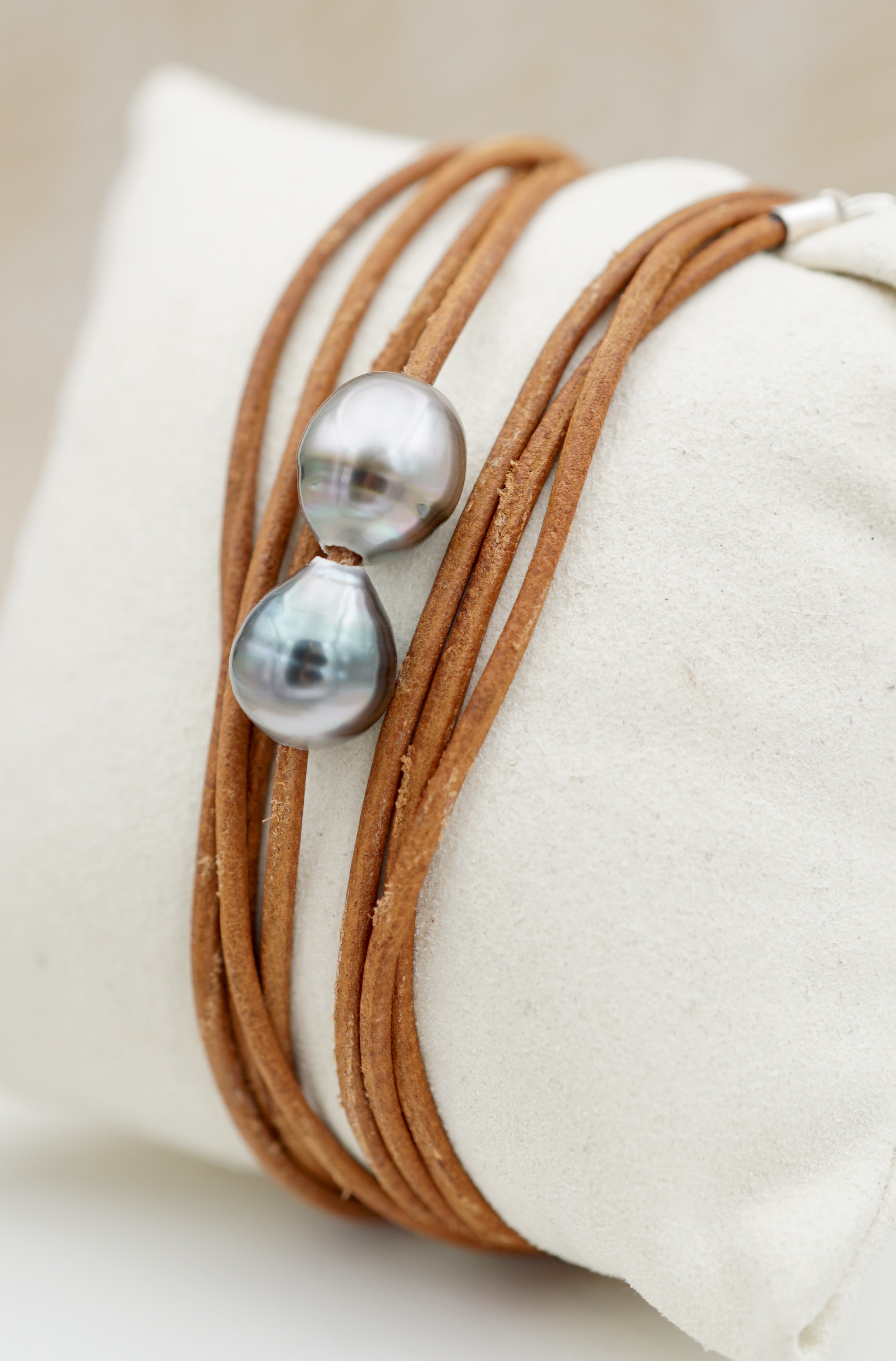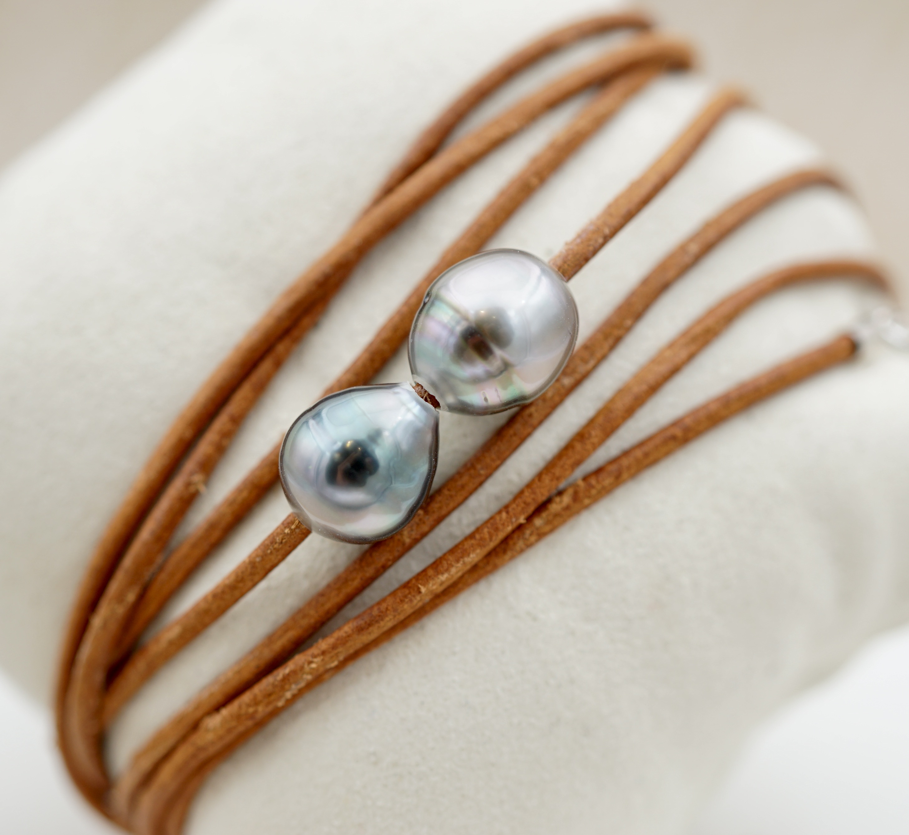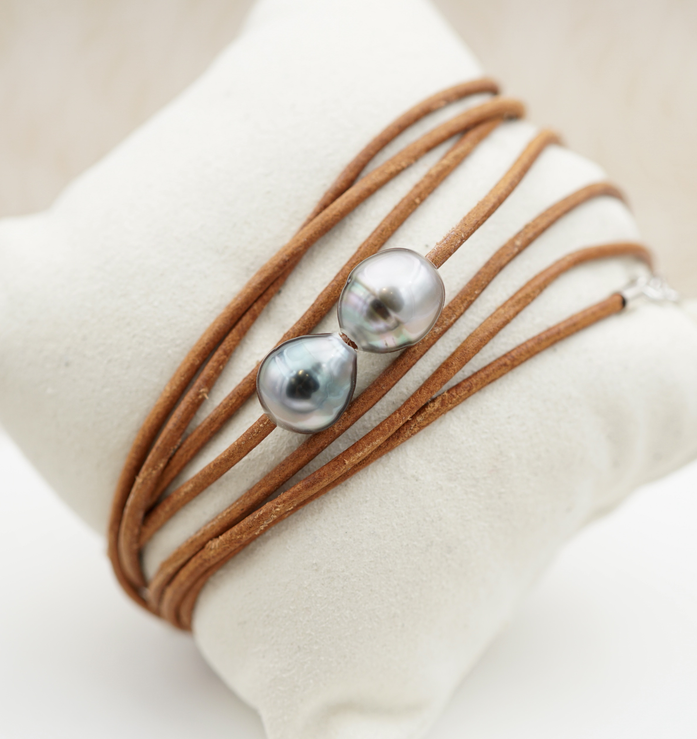 Ce bracelet en cuir véritable, orné de deux perles de Tahiti soigneusement sélectionnées, incarne un équilibre subtil entre modernité et tradition. Les perles dévoilent des reflets profonds – aubergine, vert et silver.
