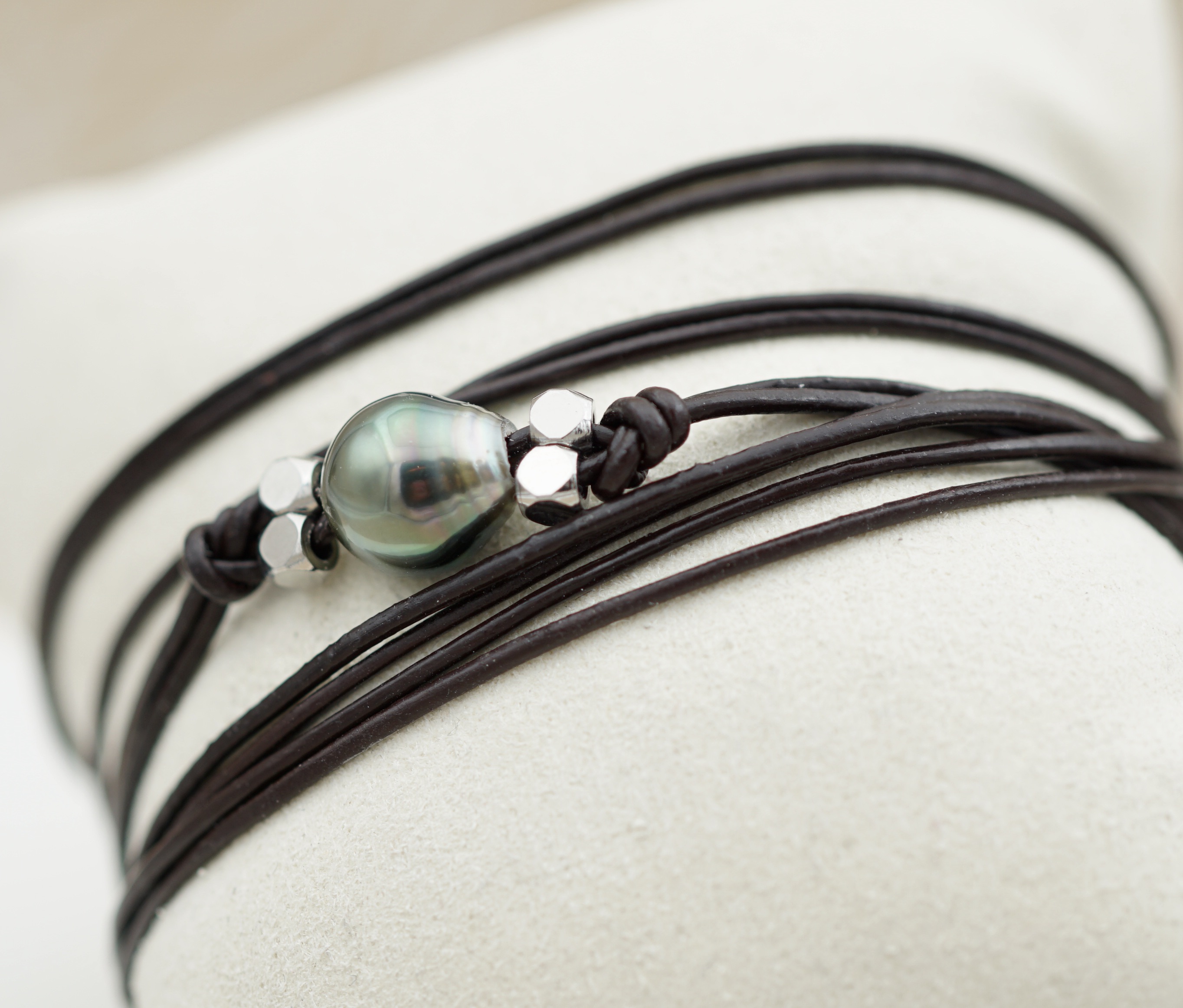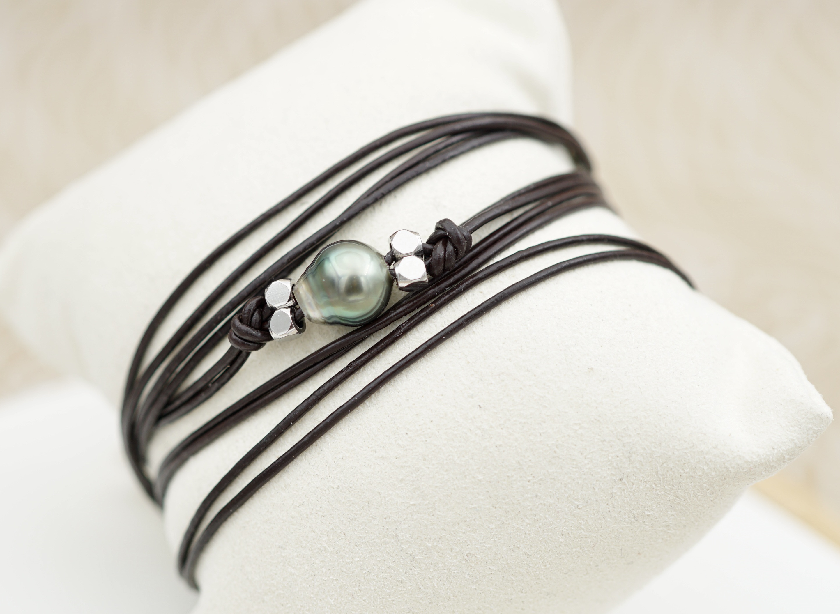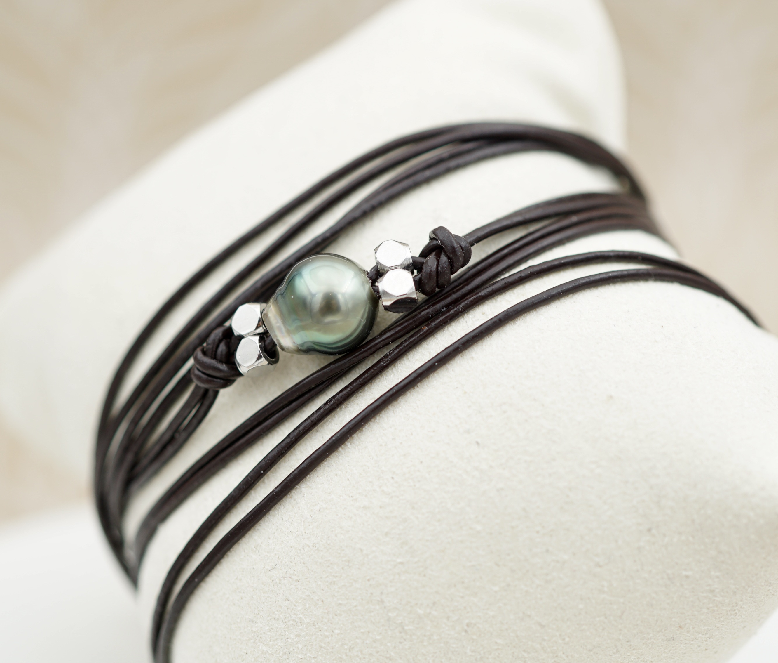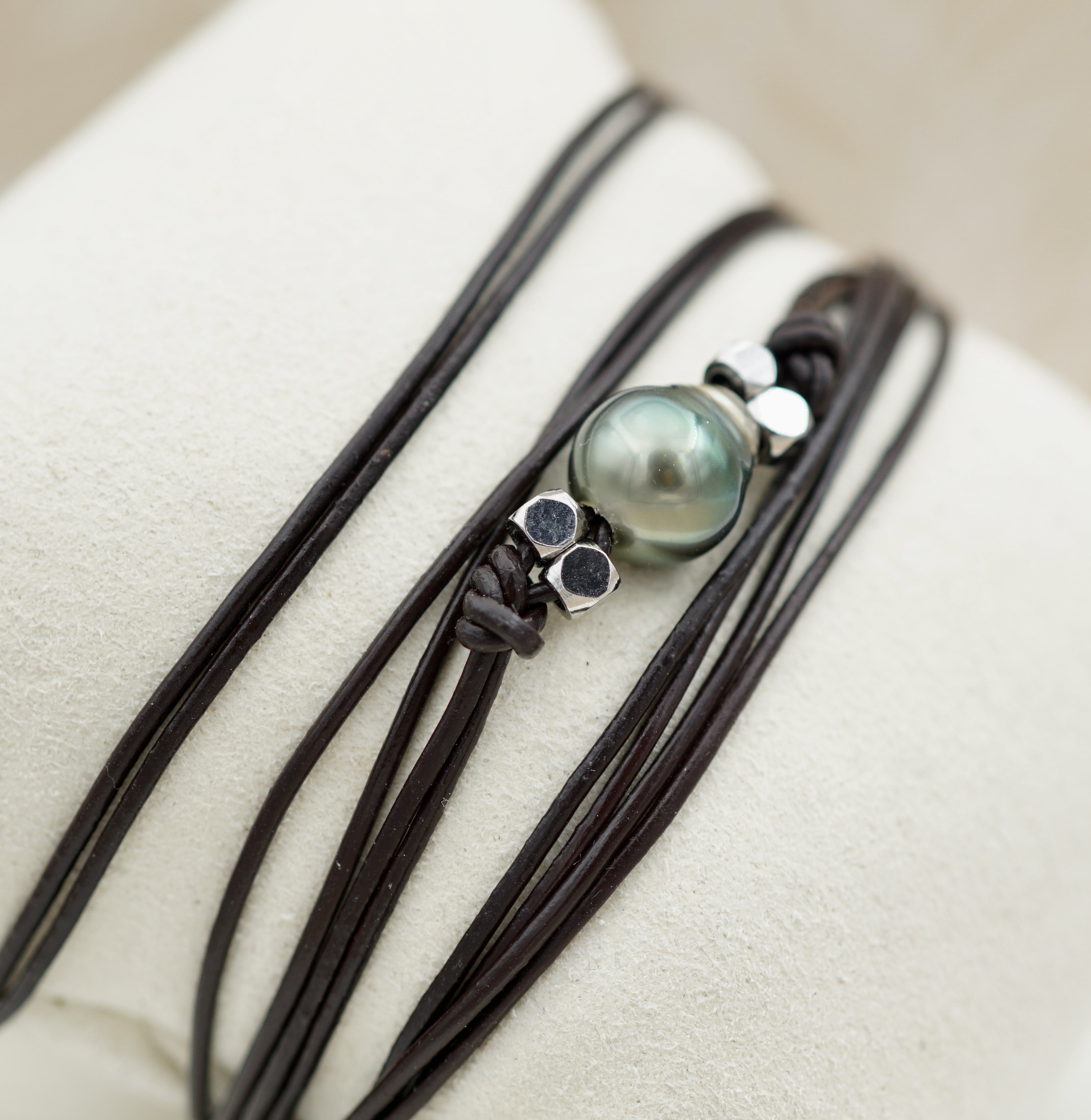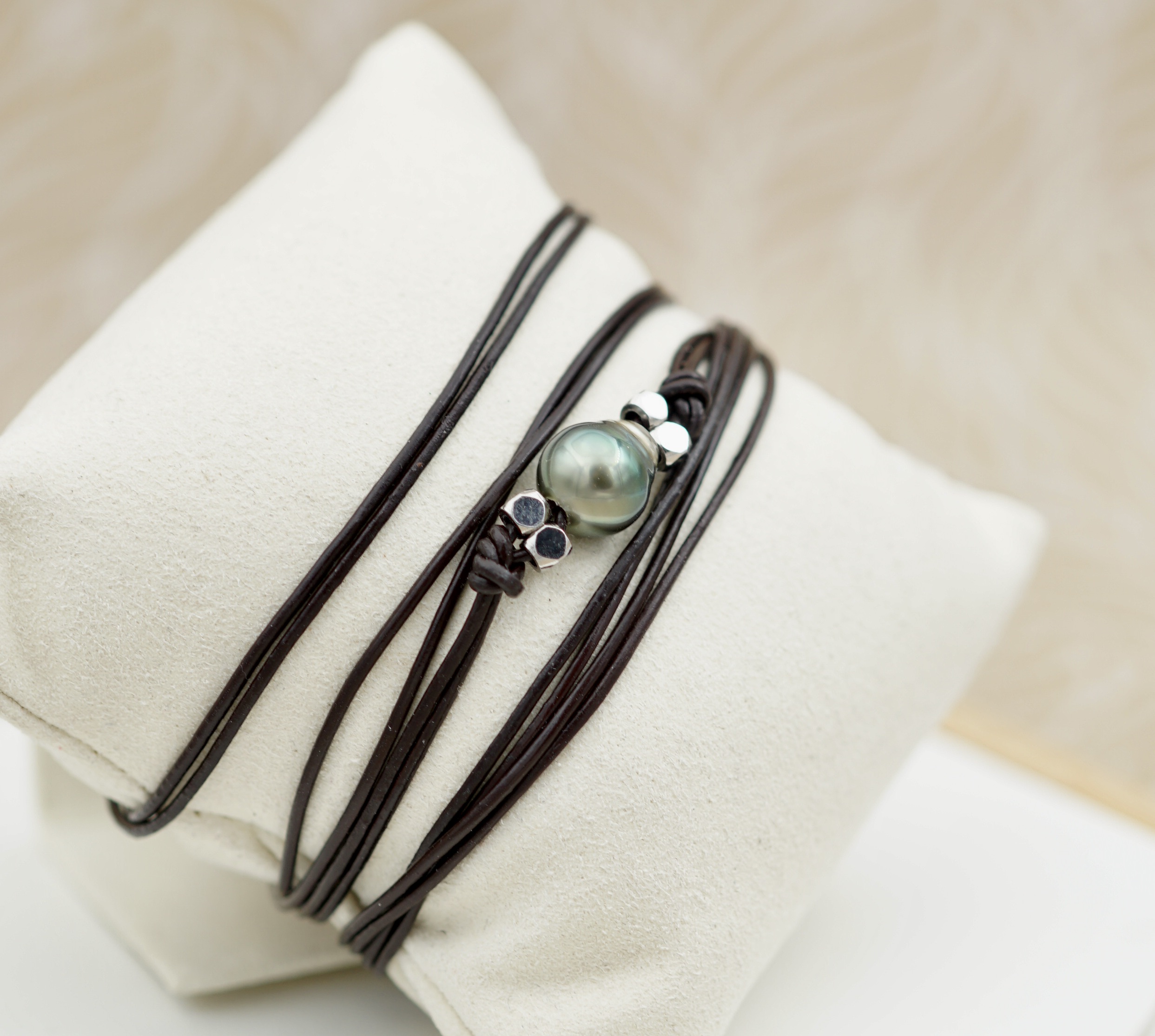 Splendide bracelet orné d’une véritable perle noire de culture de Tahiti. Sélectionnée pour son lustre profond et ses reflets uniques, chaque perle incarne la pureté des lagons polynésiens.