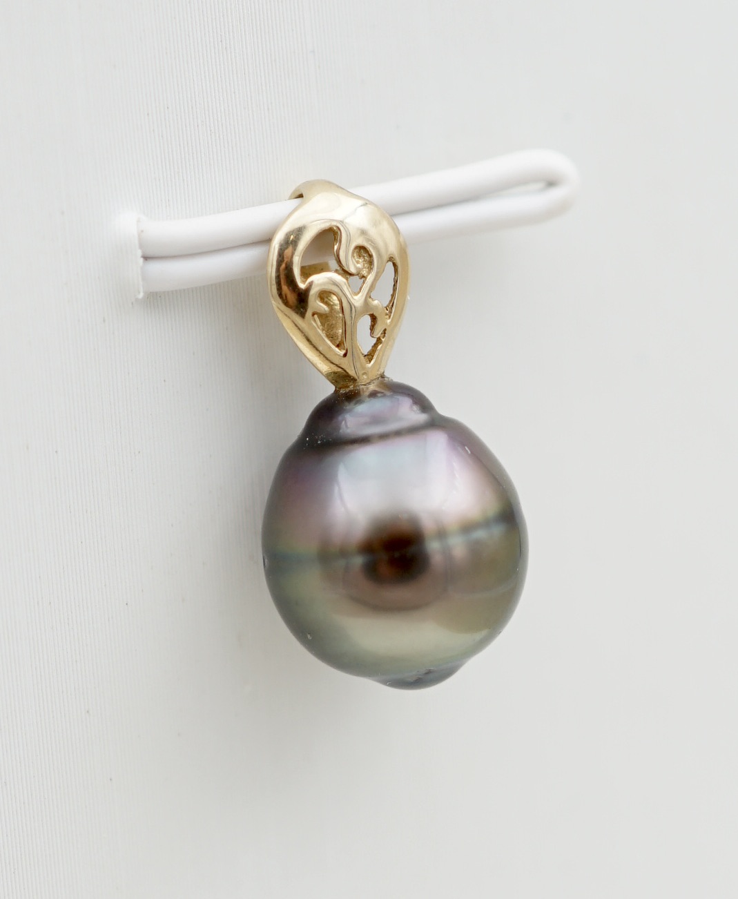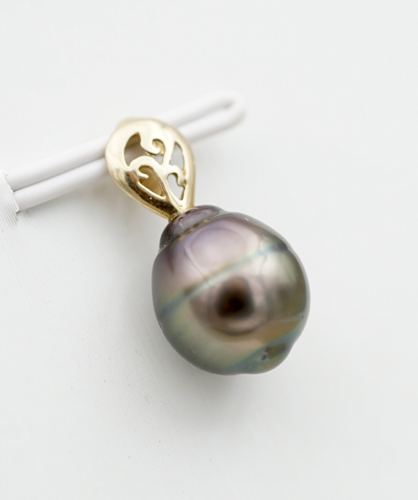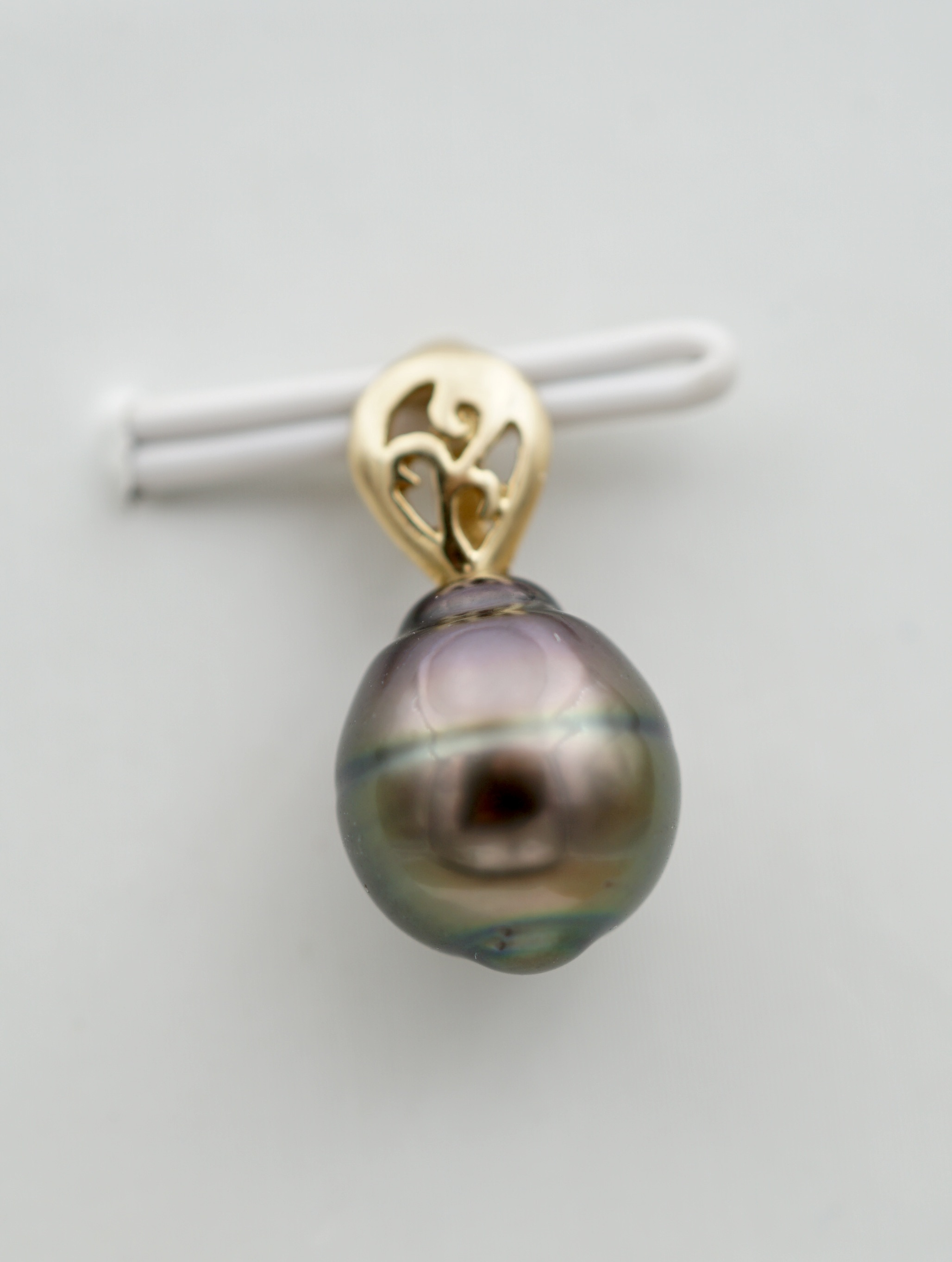 • Perle de Tahiti authentique (9 mm) : reflets aubergine, verts et dorés