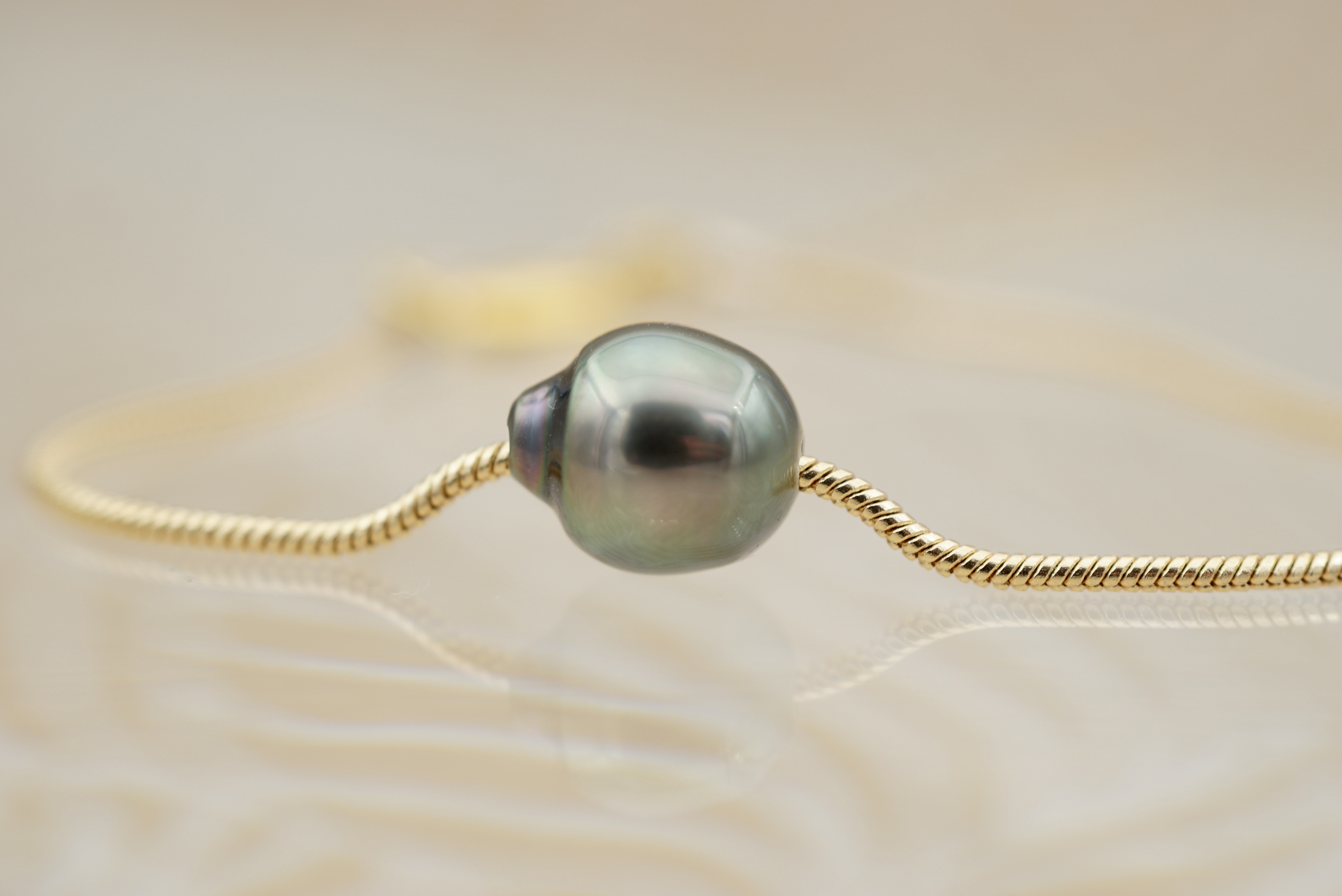 Cette perle est sélectionnée pour son lustre intense et ses reflets profonds, hérités des eaux pures de Polynésie.