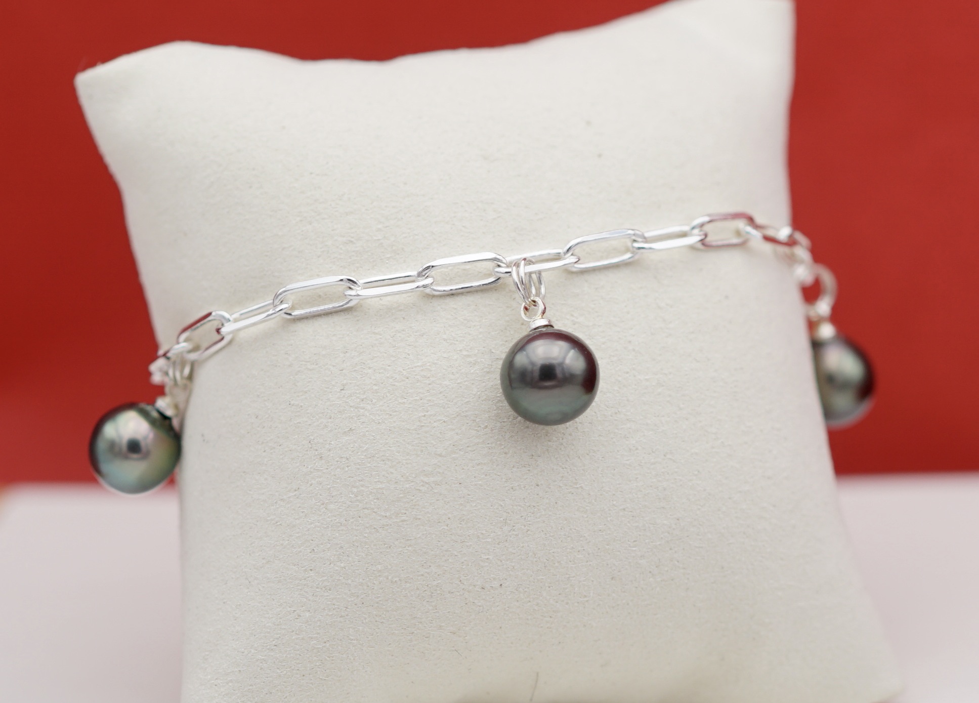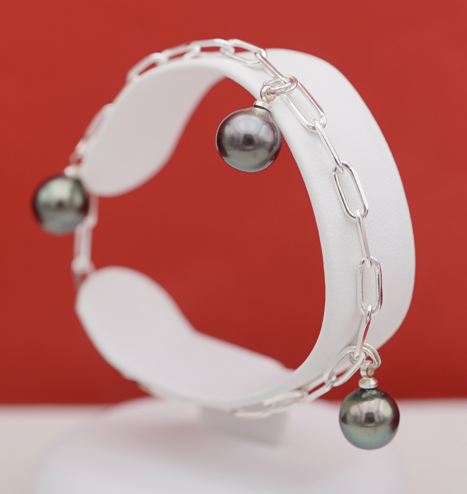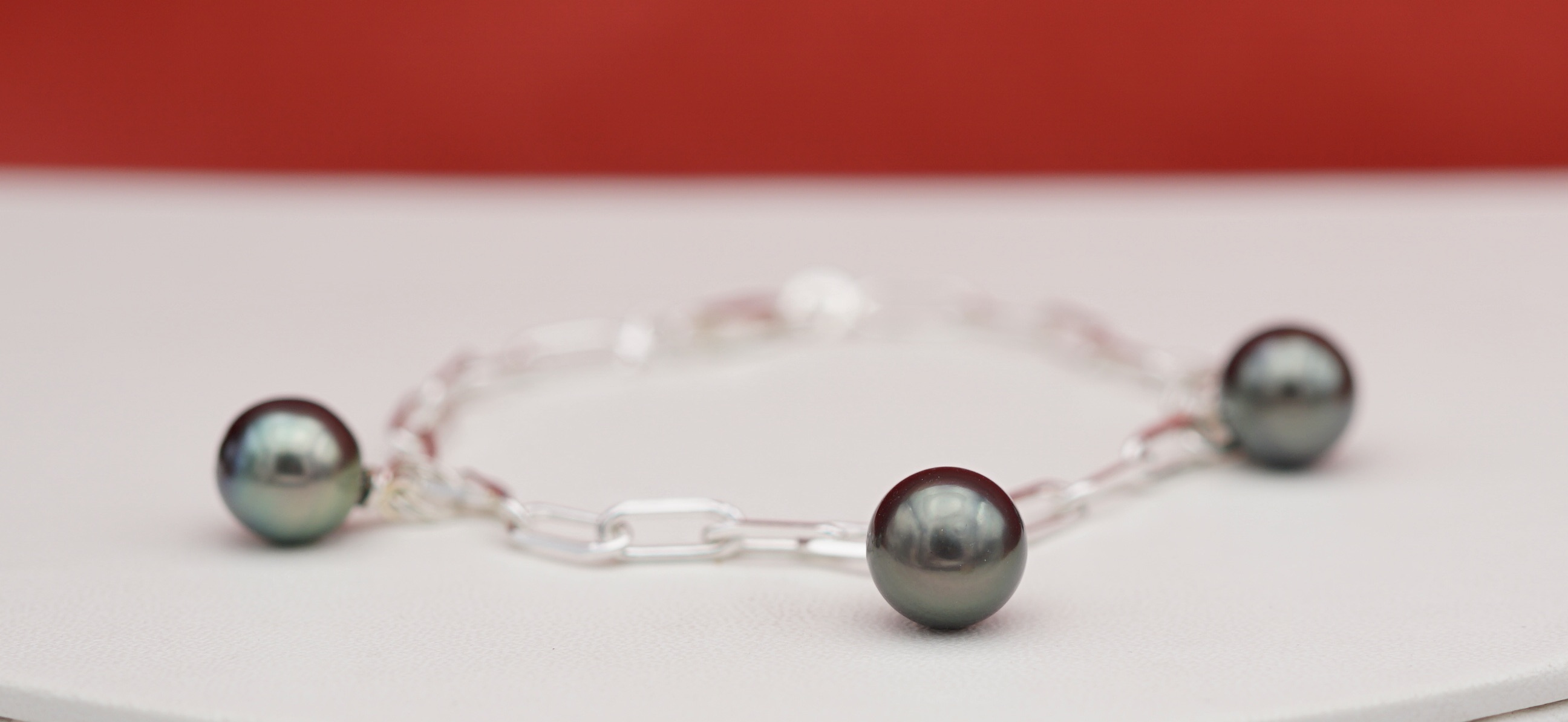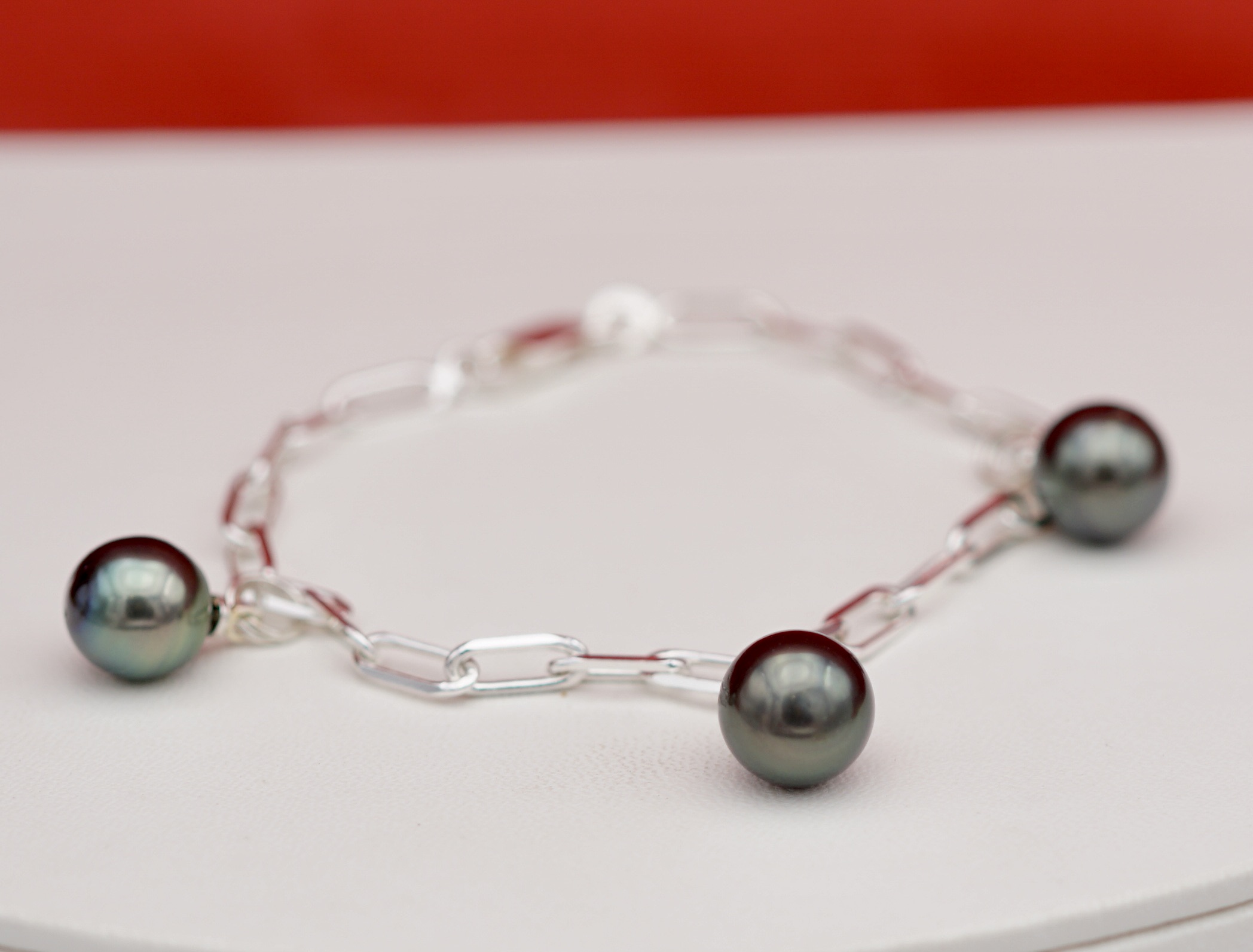 Ce bracelet en argent 925mm, orné de perles de Tahiti sélectionnées pour leur éclat unique, incarne un équilibre parfait entre modernité et tradition. Chaque perle dévoile des reflets profonds – aubergine, vert, bronze – pour un rendu à la fois subtil et luxueux.