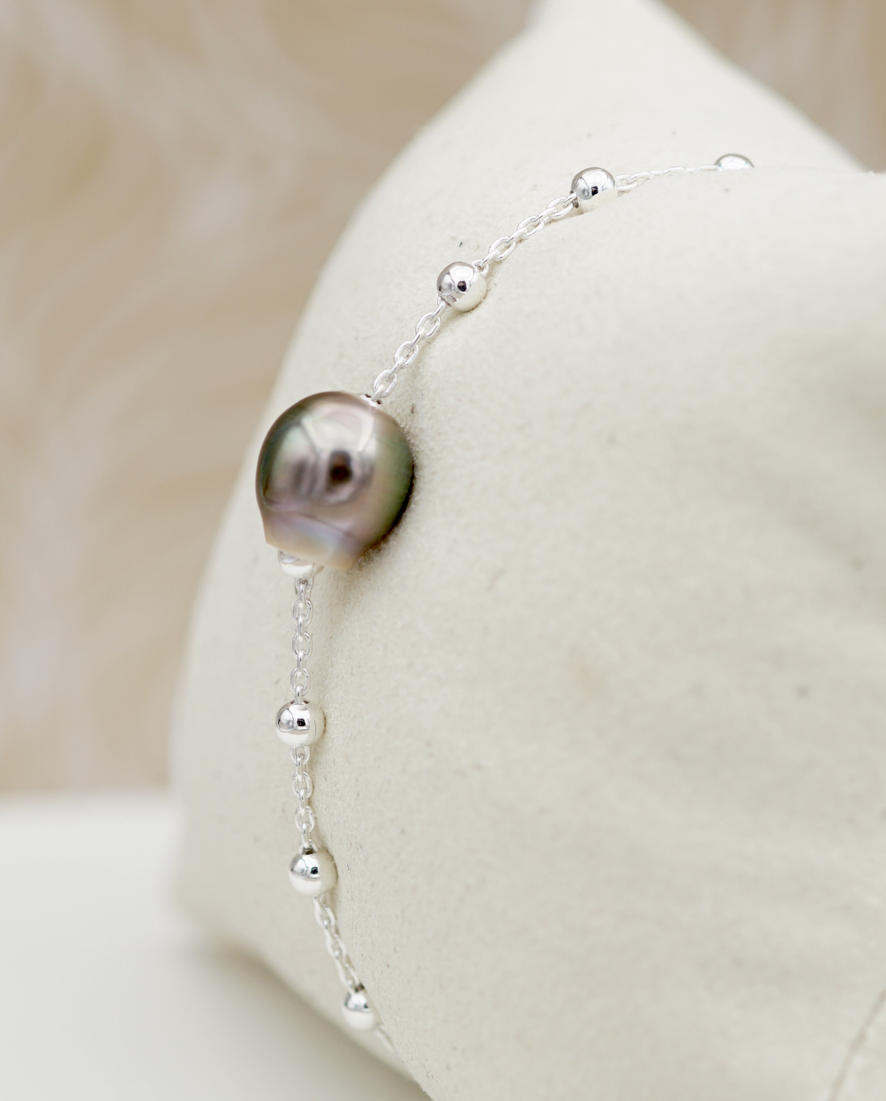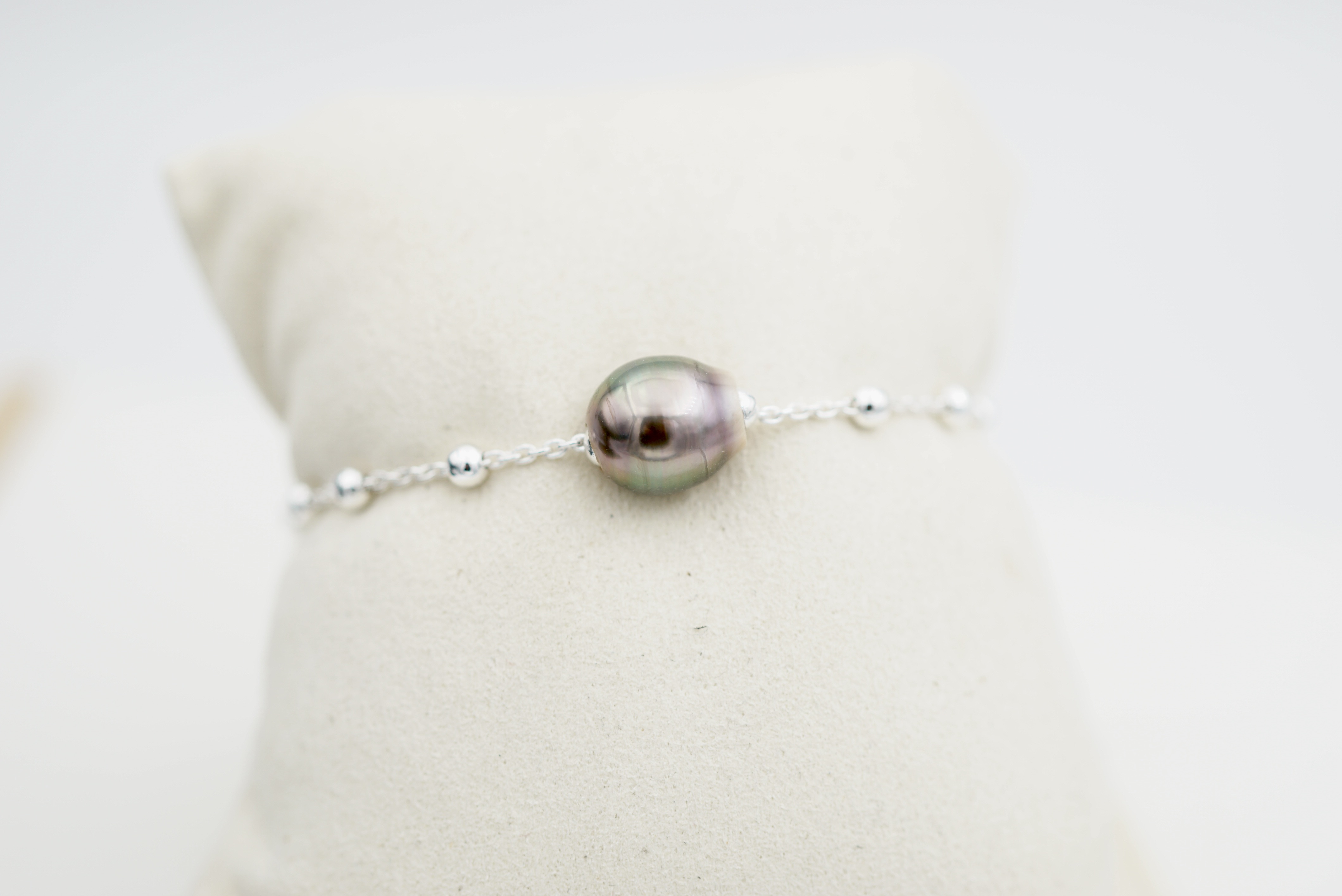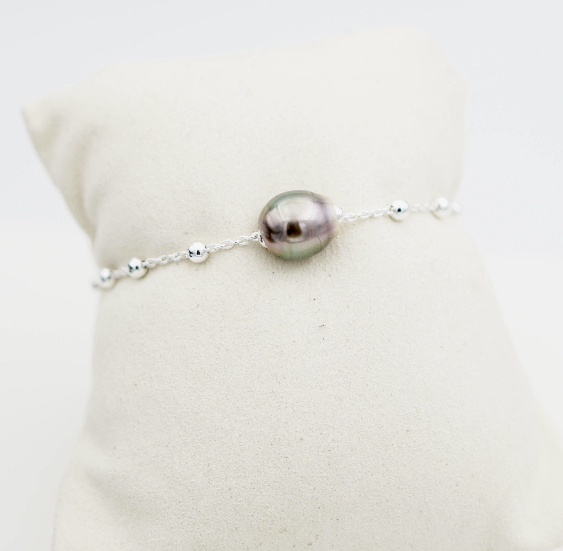 Succombez à l’élégance intemporelle de ce bracelet en argent rhodié, orné d’une sublime perle de Tahiti rigoureusement sélectionnée pour son éclat rare et leur beauté naturelle. Cettee perle, unique, dévoile une symphonie de reflets profonds : aubergine, vert émeraude, bronze ou nuances argentées – un camaïeu fascinant issu des trésors des lagons polynésiens.