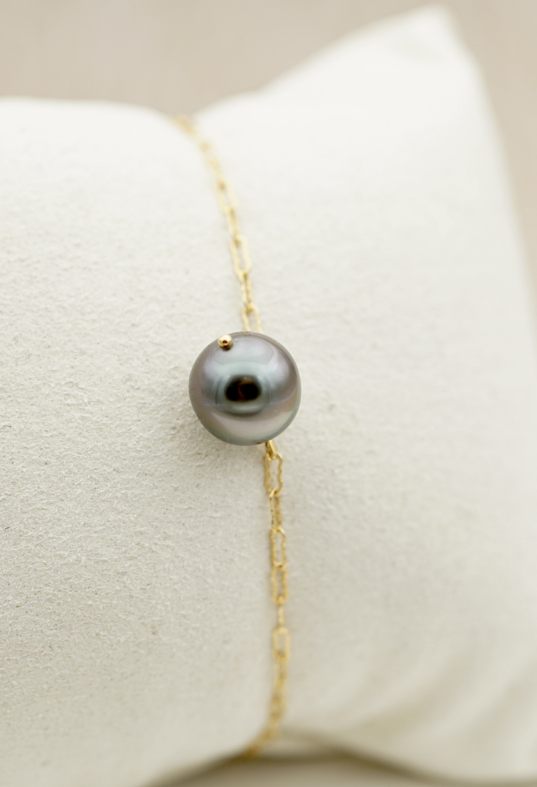 Splendide bracelet orné d’une véritable perle noire de culture de Tahiti. Sélectionnée pour son lustre profond et ses reflets uniques, chaque perle incarne la pureté des lagons polynésiens.