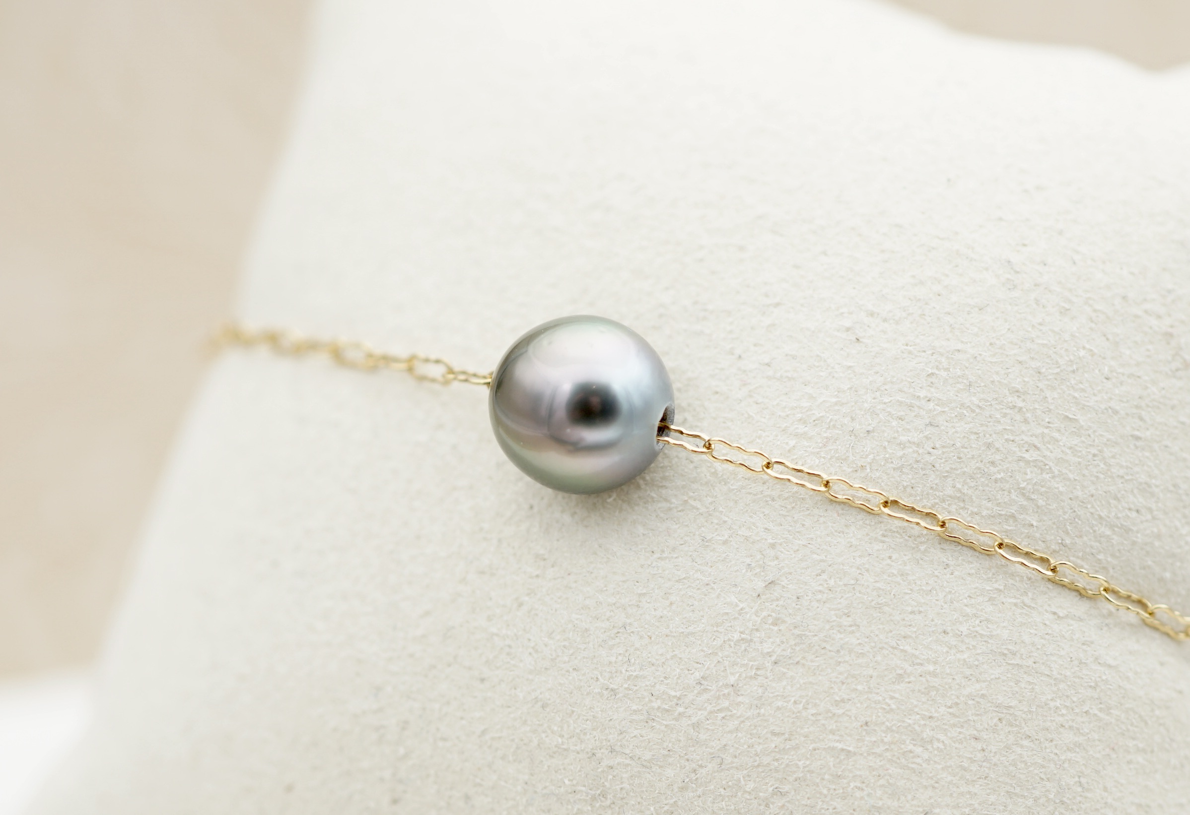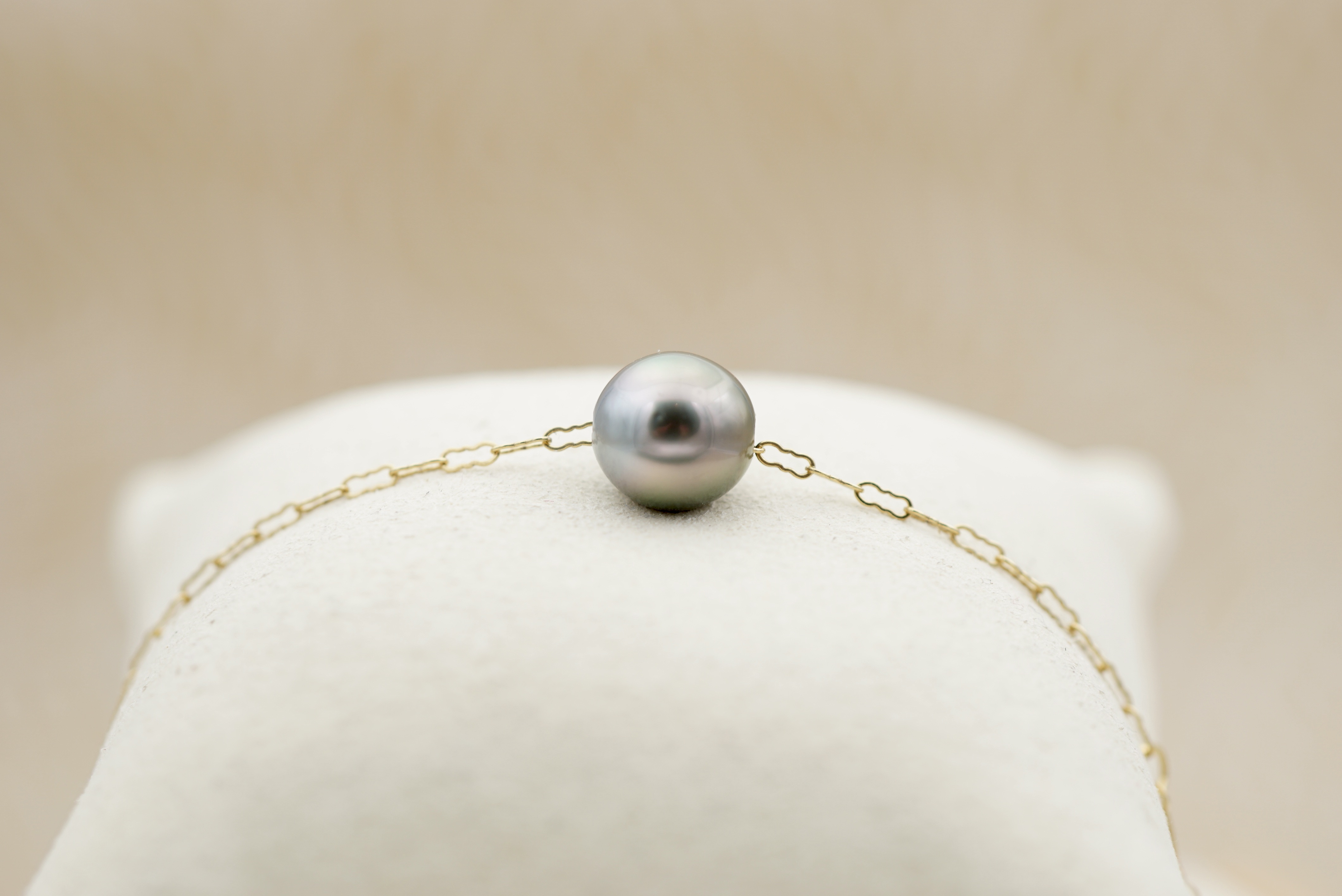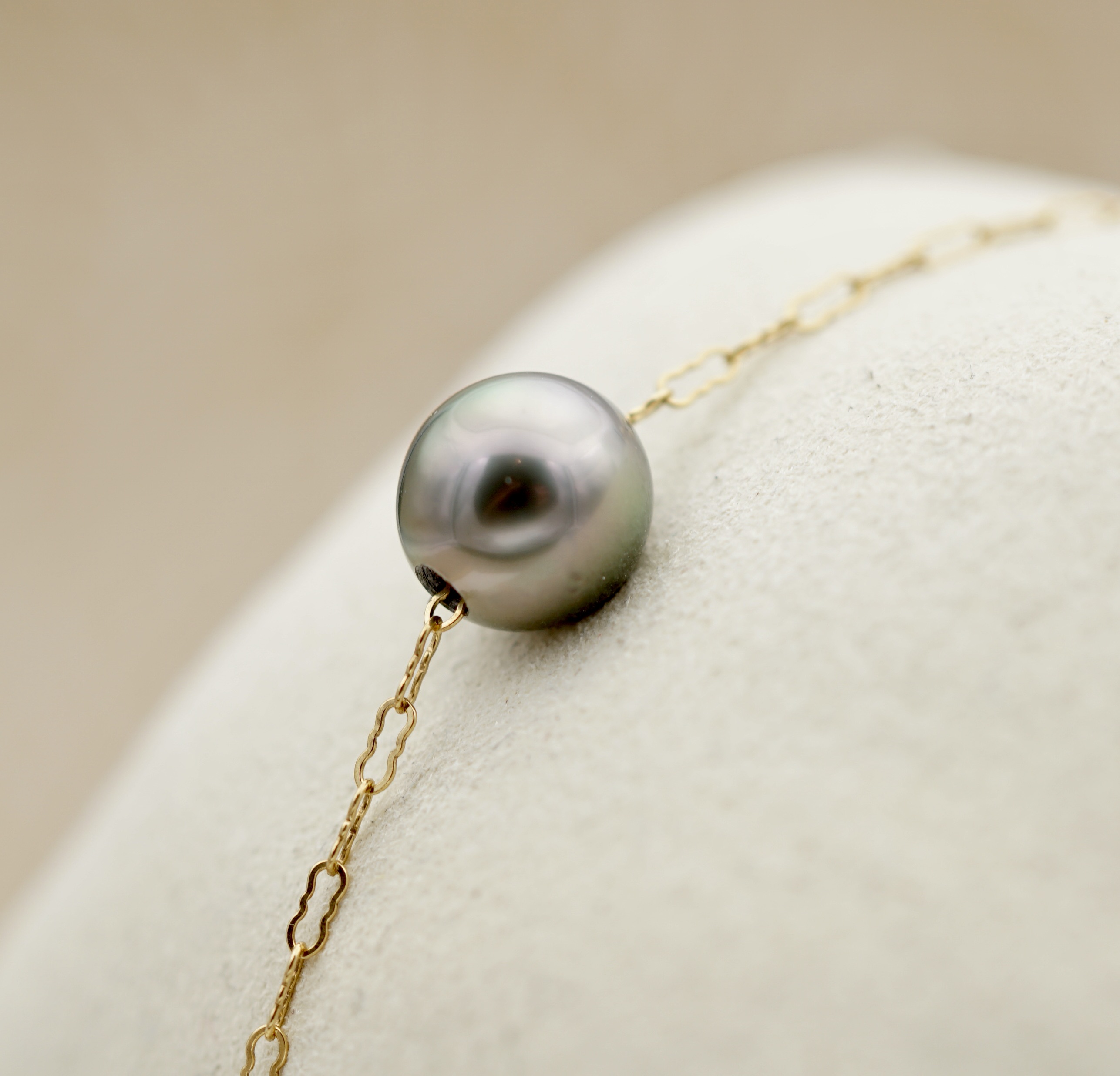 Cette perle est sélectionnée pour son lustre intense et ses reflets profonds, hérités des eaux pures de Polynésie.